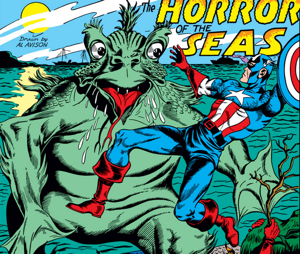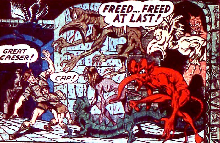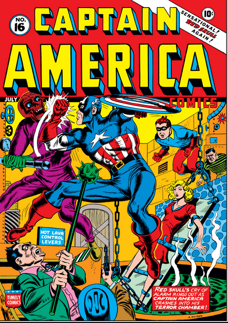 Знакомая красная рожа светится на обложке комикса Captain America Comics #16, но до неё дело дойдёт не сразу. В первой истории, под названием «Ужас морей», нацист по прозвищу «Ужас в капюшоне» (Hooded Horror) похищает Бетси Росс и переманивает на свою сторону жителей подземного города Лаи-Сон (которые заодно похищают Бакки). Капитан Америка врывается в подземный город и раскрывает местным, что нацисты их дурили. Психанув, местные решают, что лучше поубивать всех человеков, чем разбираться, кто из них норм, а кто не норм. Раз так, Кэп спасает Бакки и Бетси, после чего взрывает расставленные нацистами бомбы и уничтожает весь город, убив и жителей Лаи-Сона, и нацистов. А Стив Роджерс вновь получает нагоняй от сержанта Даффи, над которым уже в открытую потешается.