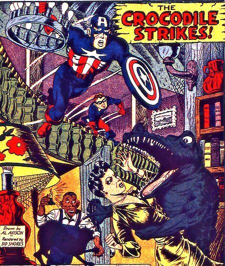 А в комиксе Captain America Comics #19 появляется гость, по сути, запустивший вселенную Марвел...но до него очередь дойдёт, а сперва «Крокодил наносит удар». Стив Роджерс и Бакки Барнс испытывают «двуместный» парашют, а после приземления видят странную картину – двуногий крокодил душит человека. Неподалёку оказывается богатое поместье, Капитан Америка и Бакки заглядывают туда и узнают, что недавно жителей поместья начал терроризировать Крокодил. Герои решают помочь...и в первой же стычке оба получают от Крокодила по голове, и решают подойти к поимке злодея с умом, проведя расследование – наверняка под Крокодила маскируется кто-то из местных. И действительно, Крокодилом оказывается садовник, который очень уж хочет похитить сокровища хозяйки поместья.