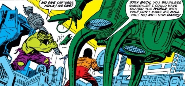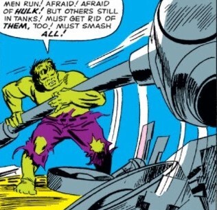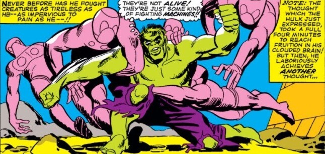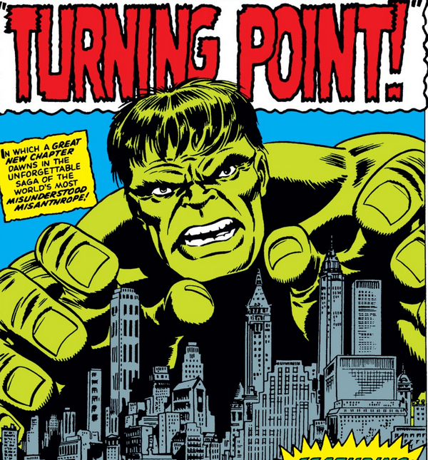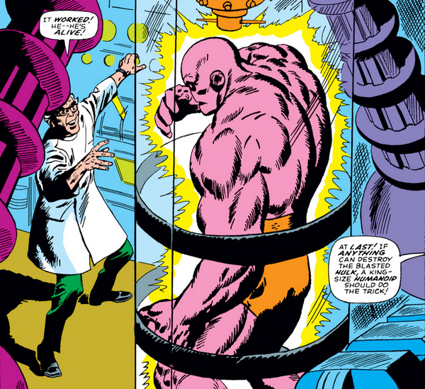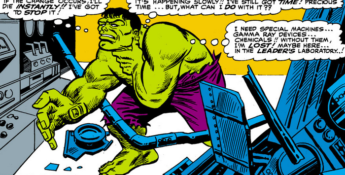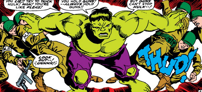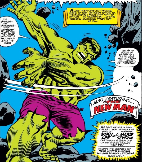 А долетит уже в комиксе Incredible Hulk #102 от Гэри Фридриха и Мари Северин. Да-да, теперь это сольник с нечестной нумерацией. Почему нечестной? Следите за руками. Вышли первые 6 выпусков сольника Халка. Затем сольник закрылся и Халк переселился в Tales to Astonish, начиная с 60 выпуска...и комикс, по сути, переименовывается в Incredible Hulk начиная со 102 выпуска. Была бы нумерация честной, этот комикс назывался бы Incredible Hulk #48. Но она не честная. Ладно, харэ душнить. В общем, падает Брюс Бэннер, вот-вот расплещется (пропасть ведёт на Землю, и падать так-то ещё далеко), но его спасает своей магией Чаровница, надеясь, что встреча с Халком поможет ей сблизиться с возлюбленным, Геркулесом. Ну а Три Воина добираются до хижины Оракула, и старуха Ольдар раскрывает им (в стихах), что Халк жив, и заодно показывает (опять же, в стихах), откуда Халк вообще взялся. Для новых читателей это пересказ ориджина Бэннера (из которого выкинули то, что при первом появлении Халк был серым...ничего, потом вернут). Если не считать отсутствия момента с серой кожей, остальное не меняли. Игорь Дреньков, Рик Джонс на жЫпе, траншея, взрыв, превращение, стычки с героями и злодеями – всё вкратце показано. Ну и разве что Халка сразу после превращения описали как “Моя крушить моя бить мелкие юдишки”, тогда как в первых комиксах он был довольно разговорчив.