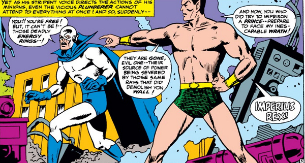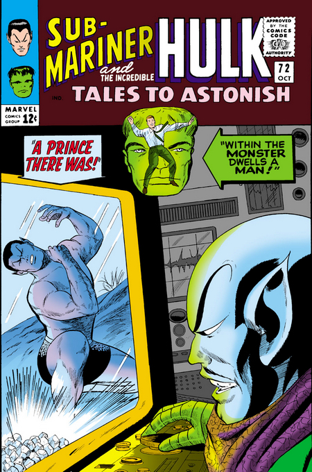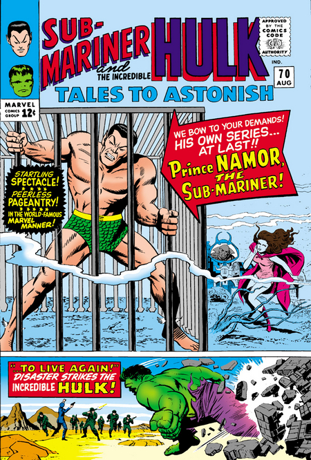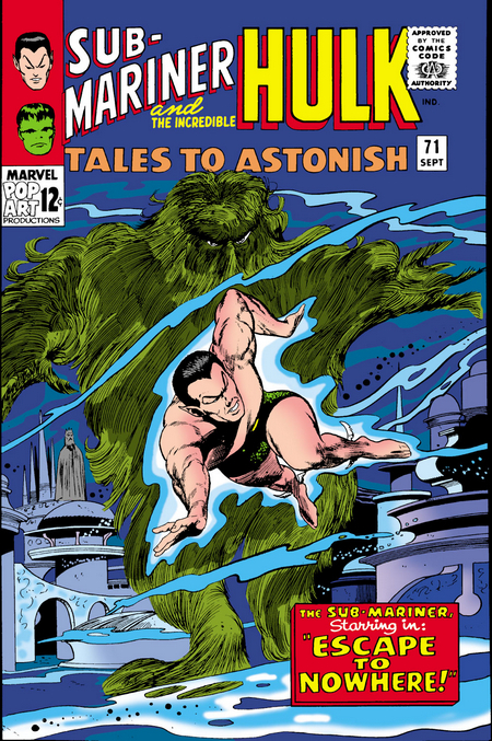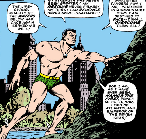 Так что сегодня пост начнётся с комикса Tales to Astonish #84 за октябрь 1966 года, с историями от Стэна Ли и рисунками от Джина Колана, Былла Эверетта и Джека Кирби. Тайная Империя взяла Нэмора в оборот, воспользовавшись его амнезией, приключившейся после особо мощного взрыва. И теперь члены Империи намерены использовать Нэмора, чтобы тот ухайдокахл Халка! Нэмор отправляется на поиски, но привлекает слишком много внимания, так что глава Тайной Империи приказывает ему найти какую-нибудь одежду (мускулистый глубоководный Аполлон в одних трусах слишком заметен). Впрочем, мускулистый подводный Аполлон в длиннополом плаще поверх трусов оказывается не менее заметен. Плюнув и раздевшись, Нэмор отправляется на поиски с воздуха (он же летать умеет), и его замечает воевода Крэнг, всё ещё удерживающий в плену леди Дорму. И решает сбить Нэмора залпом из пушки. И таки сбивает. Результат: Нэмор не пострадал, и к нему ещё и память вернулась!
