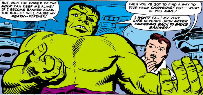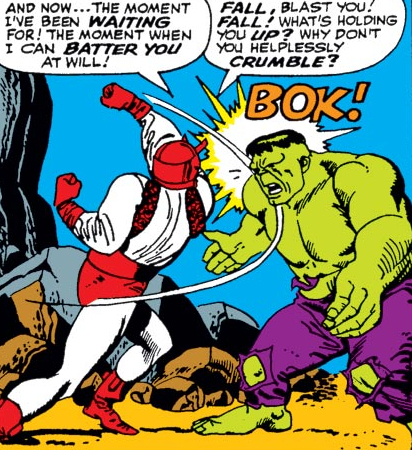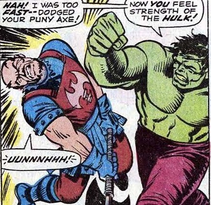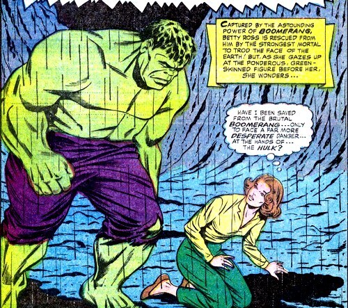 А Халк приходит в себя в медпункте, и его хвалят, как героя – он же спас Большщое Яблоко от Большого Звездеца! Президент США, Линдон Джонсон, даёт добро на исследования с целью найти способ излечить Брюса Бэннера от “болезни”, заставляющей его превращаться в Халка. Логика супер. “Наш герой спас нас, давайте найдём способ его устранить”. Халка обилие учёных и журналистов нервирует, так что он упрыгивает восвояси. Тут-то на него и нападает Бумеранг! Казалось бы, один удар, и от Бумеранга останется лишь пятно на стене, но до него попробуй доберись, а взрывчатки на нём хватит на несколько фильмов Майкла Бэя, и он ослабляет Халка усыпляющим газом. Сражение приводит к уничтожению дамбы, волной захлёстывает и Халка, и Бумеранга. Бумеранг со сломанной ногой паникует и просит, чтобы Халк его спас. Тот вроде и не против, он хватает Бумеранга и начинает выбираться из воды...но в процессе превращается в Брюса Бэннера, а Брюс же задохлик, не может на горбу взрослого мужика тащить против течения. “Ничего личного, но жить хочется” – и Брюс бросает Бумеранга и даёт ему утонуть.