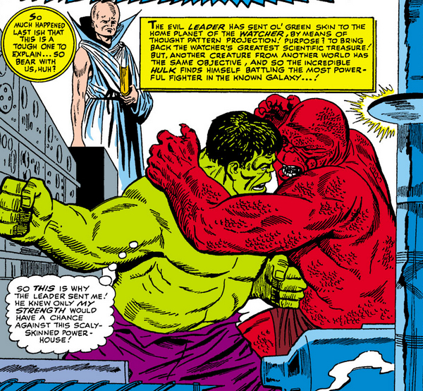 А Халк остервенело сражается с гуманоидами Вождя, чувствуя, что до смерти от пули в башке остались считанные минуты. В какой-то момент до Вождя доходит, что что-то тут не так. Отозвав гуманоидов, Вождь доставляет Халка в медппункт своего логова, где облучает гамма-радиацией, отменив/отсрочив превращение в человека, и прицельным залпом лазера удаляет пулю из мозга (если можно телепортировать Халка в своё логово, можно и пулю у него из башки телепортировать). Убедившись, что Халк больше не буянит (напомню, сейчас телом Халка управляет разум Брюса Бэннера), полностью восстановился и готов к плодотворному сотрудничеству, Вождь озвучивает свой план и выдаёт Халку задание: он узнал о существовании Наблюдателя. Цитадель Наблюдателя расположена в Синей области Луны (небольшая область, заполненная пригодным для дыхания воздухом), но сам Наблюдатель иногда телепортируется на родную планету. Халк должен добыть с той планеты один конкретный прибор – с этой целью Вождь на ту планету Халка и телепортирует. Наблюдатель приветствует Халка и обещает не вмешиваться. Но не только он пришёл за прибором! Прибор также позарез нужен инопланетному Амфибиону, который на Халка тут же и нападает. Каков будет исход сражения? Продолжение следует!