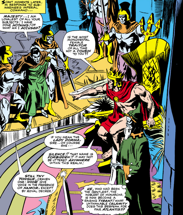 Но всё ли так плохо? Ответит комикс Tales to Astonish #70 за август 1965 года, который начинается с истории вовсе не о Великане (он же забросил супергероизм, здоровье дороже), а о Нэморе-водводнике. Возвращается Нэмор в Атлантиду после замута с Сорвиголовой, а там леди Дорма (влюблённая в Нэмора атлантийка) предупреждает его, что в его отсутствие престол захватил воевода Крэнг. Да не тот мозг в пузе робота, а чистокровный атлантиец. Дорма ластится к Нэмору, а тот ей не даёт, вот она со злости и вызывает стражников, те Нэмора скручивают и приводят в тронный зал к Крэнгу (Дорма наивно рассчитывает, что увидев Крэнга на престоле, Нэмор, как типичный омежка, вздохнёт печально, откажется от престола и возьмёт её в жёны). А Крэнг бросает Нэмора в подземелье. А Дорме совестно, она крадёт ключ и освобождает Нэмора, и тот отправляется на поиски Трезубца Нептуна, чтобы узурпатору навалять. А Крэнг на это и рассчитывает – наверняка Нэмор погибнется насмерть в одной из ловушек по пути к Трезубцу!