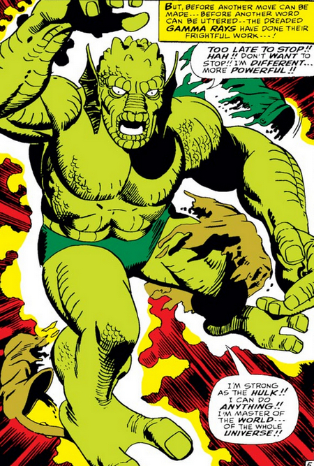 Странник же приказывает Халку начать уничтожение человечества с уничтожения военных баз, а сам сваливает в космос, чтобы не путаться под ногами. Халк отправляется к ближайшей базе, но по пути превращается в Брюса Бэннера. А Брюса-то Странник не контролирует. Поняв, что рано или поздно он вновь станет зелёным великаном, Брюс решает, что лучше всего будет самовыпилиться, и отправляется к базе, где находится его старая лаборатория. Туда же отправляется шпион по имени Эмиль Блонски, и видит, как Брюс Бэннер активирует особый прибор, планируя облучить себя смертоносной дозой гамма-радиации, которая его абсолютно точно убьёт (потому что Гамма-радиация всегда работала как надо и не приводила к несчастным случаям и позеленению). Но Брюса скручивают и уводят подоспевшие солдаты, а Блонски от них прячется. Он не в курсе, для чего предназначен прибор, но решает опробовать его на себе, потому что именно так поступают опытные и умелые шпионы. Концентрированный пучок гамма-лучей превращает Эмиля Блонски в огромное чешуйчатое мерзкое существо, и Мерзость (Эмиль не выбирал такое прозвище, его так за кадром обозвали) ломает прибор прежде, чем уровень радиации станет смертоносным. Брюс психует, превращается в Халка и выходит против Мерзости...но концентрированная гамма-радиация привела к тому, что Мерзость по всем параметрам превосходит Халка: выше, быстрее, сильнее, выносливее, и ещё Эмиль в форме Мерзости не теряет свой интеллект! Накидав Халку по голове, Мерзость похищает Бетти Росс и упрыгивает с ней в неизвестном направлении...тут-то генерал Росс и понимает, что Халк не был настоящей бедой.