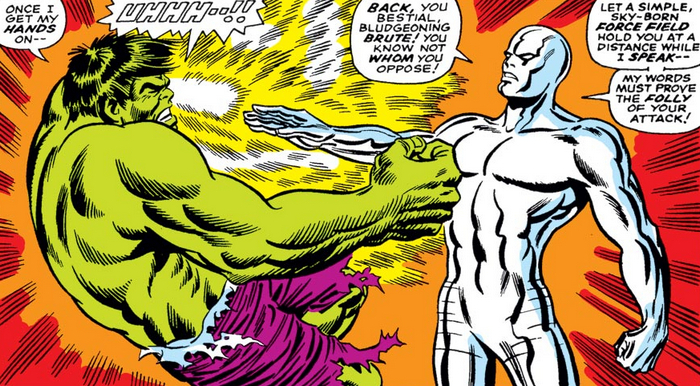А Халк же в курсе, кто такой Серебряный Сёрфер, вот и требует, чтобы герольд Галактуса унёс его в космос. А Сёрфер отказывается. В принципе, он и рад бы, но Галактус наказал своего герольда за предательство и запер на Земле, соорудив вокруг неё противосёрферский барьер (любой звездолёт пройти может, а конкретно Серебряный Сёрфер – нет). Халк не верит и лезет в драку. Сёрфер накидывает ему и сваливает, зато прибывает полиция с огнемётами (нестандартная экипировка, но в Нью-Йорке ради выживания ещё не так вооружишься). Сёрфер, добрая душа, уносит Халка подальше от огнемётчиков, а неблагодарный зелёный остолоп пытается отжать его доску. К раздражению Халка, доска его не слушается, и угрозы на неё не действуют. В итоге Сёрфер нокаутирует Халка, заглядывает ему в голову с помощью телепатии и видит проблемную ситуацию Брюса Бэннера. И такой “Ну, это исправимо, я же могу в трансфигурацию!”. И вот, Халк просыпается, видит, что Сёрфер светит на него ладошкой, и такой “Ах ты падла серебристая, решил Халка по тихому добить, пока Халк в отрубе валяется?! Нна по щщам!”. А Сёрфер такой “М-да, пойду-ка я”. И сваливает. А Халк клянётся, что рано или поздно найдёт его, засунет доску ему в задницу и заставит “сотрудничать”. Но когда это будет... продолжение следует!