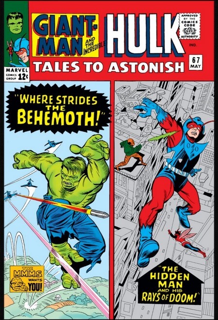 А приходит в комикс Tales to Astonish #67 за май 1965 года, с историями от Стэна Ли и рисунками от Боба Пауэлла (Великан) и Стива Дитко (Зелёный Великан). Таинственный Сокрытый Человек с помощью особого излучателя похищает знания различных учёных. Пытается и Великана облучить, но случается облом – резист Великана столь велик, что излучатель ломается. Не унывая, Сокрытый берётся за других учёных, и Генри Пим вскоре понимает, что всё серьёзно – всё больше учёных жалуются на странный полный склероз и неспособность вспомнить собственные наработки. Великан берётся за расследование, и в определённый момент уменьшается, чтобы удобнее было помочь Осе (Джанет ужалила пчела). Тут-то его и облучает Сокрытый. Хэнк забывает, как уменьшаться, но ещё помнит, как увеличиваться. Став Великаном, он догоняет и сбивает летательный аппарат Сокрытого. Тут же прибывают инопланетяне, сообщают, что Сокрытый – преступник из их народа и они его накажут по всей строгости, а в качестве компенсации за неудобства они используют свою чудо-технику, чтобы вернуть всем учёным их воспоминания. Только Пим всё равно не помнит, как уменьшаться до размеров муравьишки. Теперь он может быть только Великаном (уменьшиться до человеческого роста может, но попытки уменьшиться ещё сильнее приводят к слабости, головокружению и потере сознания).