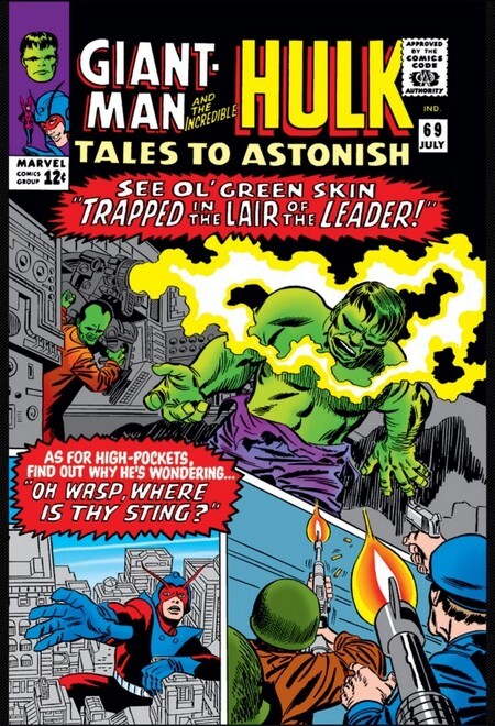 Так что сегодня начнём с комикса Tales to Astonish #64 за февраль 1965 года, от Леона Лазаруса и Карла Баргоса (история о Великане) и Стэна Ли и Стива Дитко (раздел о Халке). Сначала – история о Великане. Хэнк Пим (Человек и пароход Муравей и Великан) трудится в лаборатории, Джанет ван Дайн (Оса) пытается помогать, но роняет ящик с пробирками, те бьются, Пим психует, Джанет обижается и понимает, что зря вообще пытается добиться внимания Пима. Он старше неё и больше заинтересован в научных трудах, чем в отношениях. Джанет покидает Пима, оставив ему записочку, Пим психует ещё сильнее, но теперь злится на себя, мол, упустил сокровище. А самолёт, в котором Джанет летит в Европу, угоняет Аттума, давний враг Нэмора, и собирается вскрыть Джанет, в качестве анатомического пособия по изучению строения жителей поверхности. Но Джанет удаётся послать муравьишку с просьбой о помощи Хэнку. Так что когда Аттума уже собирается приступить ко вскрытию, ему приходится иметь дело не со слабой перепуганной девушкой, а с разъярённым Великаном! Чтобы Джанет не чувствовала себя ненужной, Пим прихватил для неё уменьшающие капсулы и костюмчик Осы. Накидав люлей Аттуме, Великан и Оса признаются друг другу в любви, взаимно просят прощения и улетают в закат.