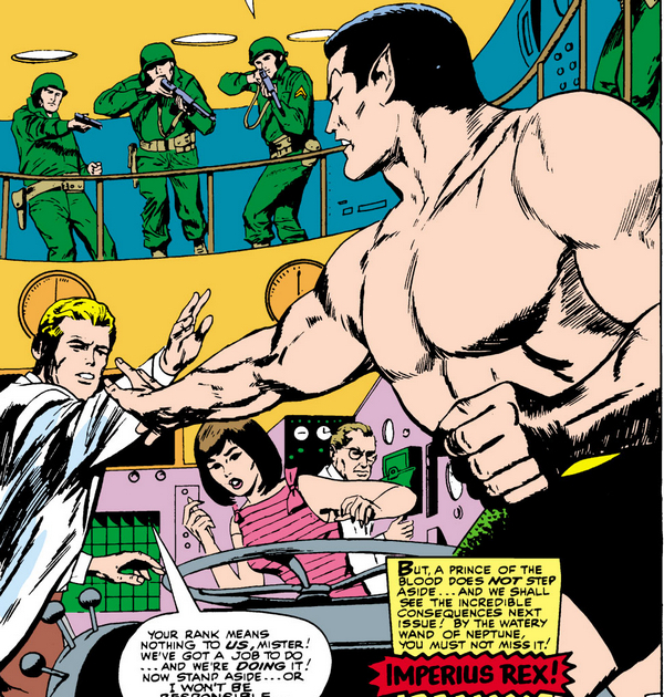 А ответ – до комикса Tales to Astonish #81. Но сначала, конечно же, Нэмор. Узнав, что Дорма ушла к Крэнгу, Нэмор в ярости – вот же шалашовка синекожая! Он-то не в курсе, что Крэнг её шантажирует. Вашти пытается Нэмора урезонить, но буйный принц Атлантиды никогда не отличался сдержанностью и хладнокровием, он рвёт и мечет. Доходит до нового указа: Нэмор объявляет само имя леди Дормы вне закона, бросает её единственного родственника в темницу. Вашти с тоской осознаёт, что психиатров в подводном царстве нет. А развоевавшийся Нэмор собирает армию и приказывает найти и убить Крэнга. “Вот как знал, что нельзя было играть в добренького и отпускать его!”. Крэнг же понимает, что долго скрываться не выйдет, обрабатывает себя и Дорму газом, который позволит дышать на поверхности, и решает спрятаться с ней в мире людей. И тут Нэмор его таки засекает...