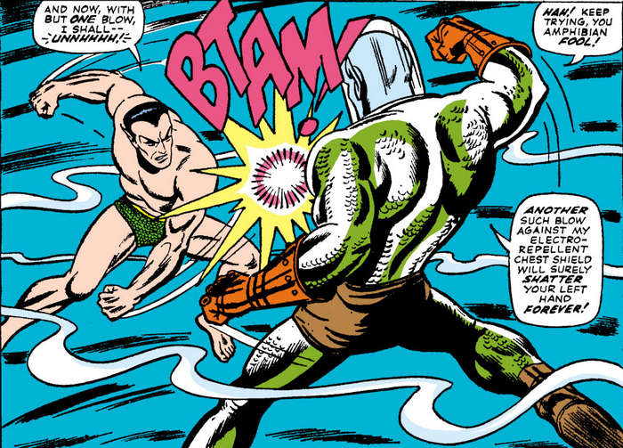 Но сегодняшнюю яркую часть подборки пора завершать на комиксе Tales to Astonish #83 за сентябрь 1966 года, от Стэна Ли, Джека Кирби и Билла Эверетта. Нэмор отправляется в погоню за подлодкой Крэнга, продолжая сыпать проклятиями в адрес Дормы. Но подлодка Крэнга отлично вооружена. Гидробластер Нэмору не помеха, он просто таранит субмарину собственной тушкой. Но подлодка вооружена ещё и звуковым бластером. Поскольку это высокоточное орудие, Крэнг планирует поразить уязвимую часть головы Нэмора, чтобы вызвать у него амнезию типа той, из-за которой Нэмор провёл долгое время на суше, пока ему случайно не вернул память Человек-Факел. Но Крэнг промахивается, и Нэмор начинает разбирать его подлодку (которая, кстати, ещё и летать умеет). Но Крэнг так-то и сам вооружён, да к полю боя ещё и Тайная Империя прибывает, надеясь завербовать Нэмора. “Номер Раз” из Тайной Империи вооружён Лоботомизатором, но даже не успевает пустить его в ход – Крэнг выпускает в Нэмора мощную ракету. Нэмор переживает залп, да ловит амнезию. Тут-то Номер Раз и берёт его в оборот. “Э...кто я? – Ты мой лучший друг. А я твой лучший друг. А всё остальное человечество - твои враги!”.