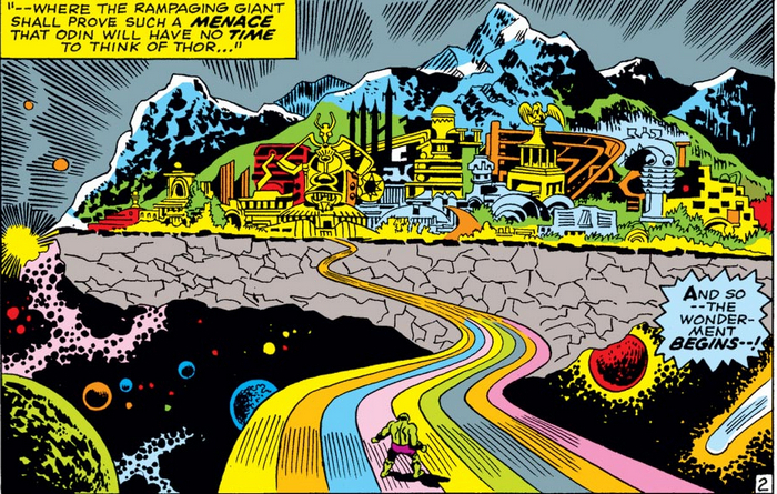Нэмор сваливает, а я предлагаю перейти к комиксу Tales to Astonish #101. История о Нэморе в нём есть, но будем честными, кому не пофиг на Нэмора? Точно не мне. Локи задумал новый план – использовать Халка для захвата Асгарда! Найдя Брюса Бэннера, валяющегося на пляжу в неглижу после стычки с Нэмором, Локи превращает его в Халка и переносит прямиком на радужный мост Бифрёст. И Халк топает к Асгарду. Предупреждения Хеймдаля ему не страшны, а атаки зачарованным мечом Халка только злят. Хеймдаль слегка приседает на очко. “Я вижу движение крылышка колибри в соседней вселенной! Слышу, как растёт трава в соседней галактике! Но ни разу не видел столь сильного смертного и не слыхал о нём! – Слышишь траву, говоришь? Ну-ка прислушайся!”. И Халк хреначит ручищами по Бифрёсту так, что радужный мост содрогается и Хеймдаль, оглушённый, с него падает!