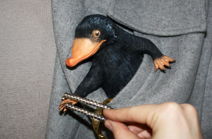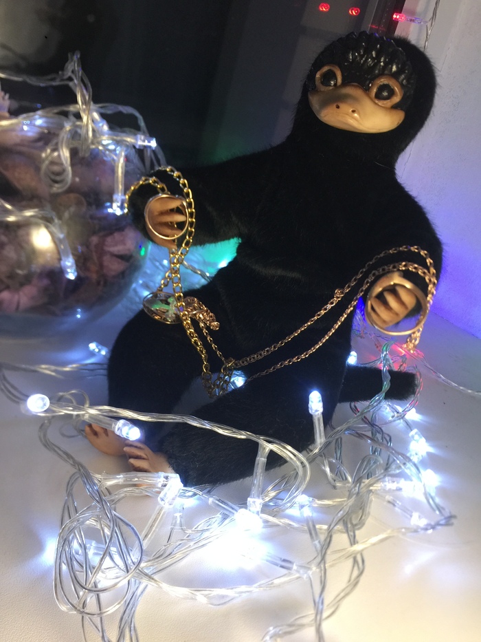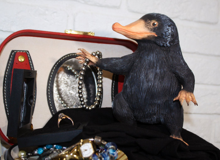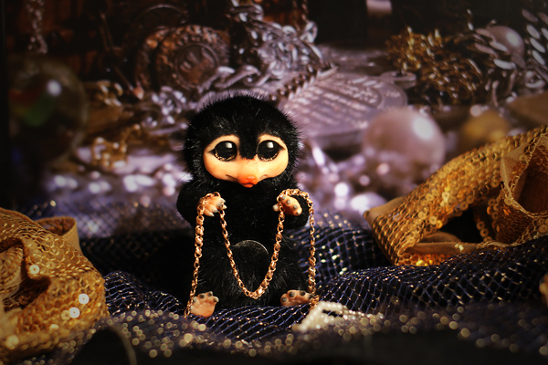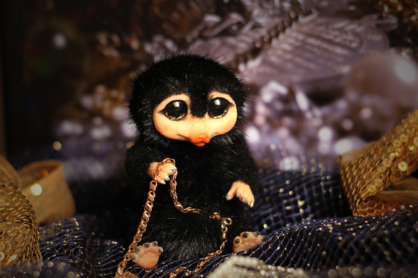 Нюхль (Нюхлер) – один из ярких персонажей картины, пушистый черный зверек, похожий на утконоса. Он обожает все блестящее, особенно если это ювелирные украшения. При этом все сокровища он хранит в сумке на брюхе, в которой помещается богатств даже больше, чем в самом большом сундуке.