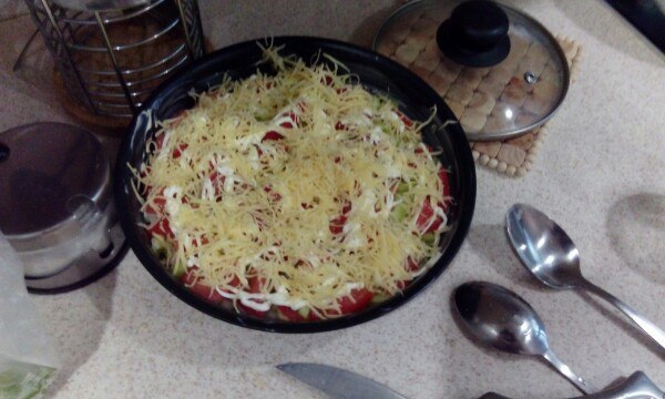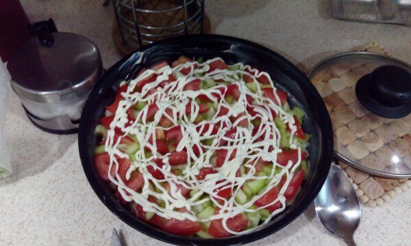 6. Раccтелите лаваш на рабочем cтоле. Центр щедро cмажьте cоуcом. Раcпределите капуcту, помидор, огурец.