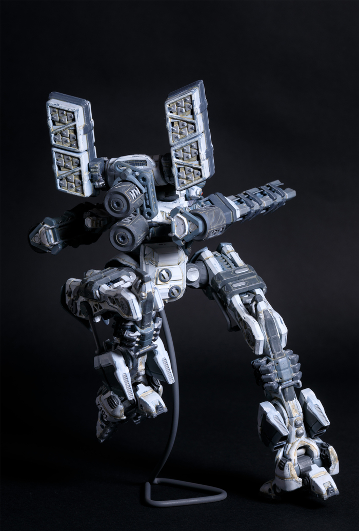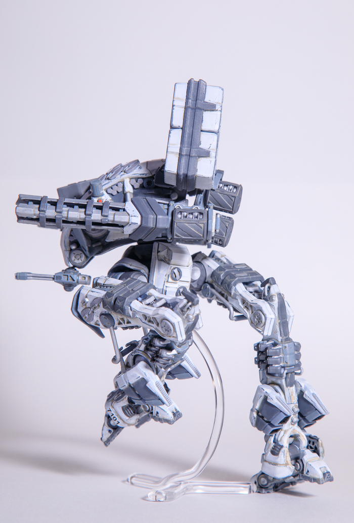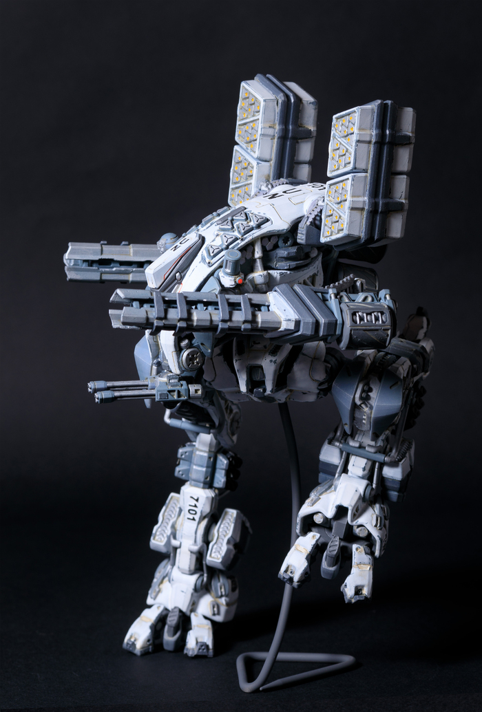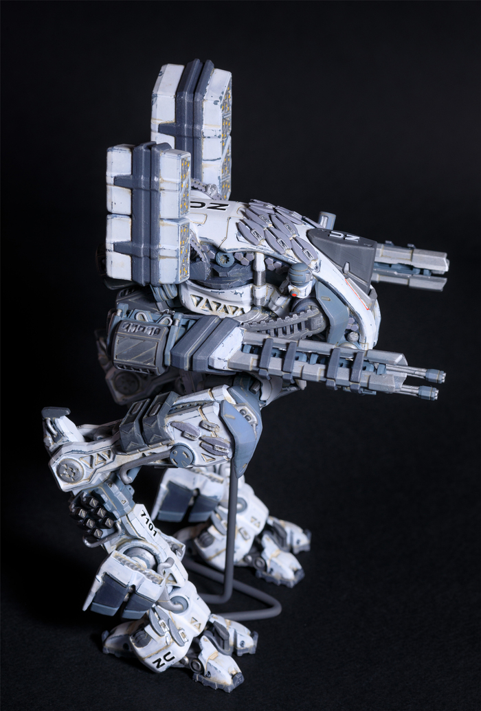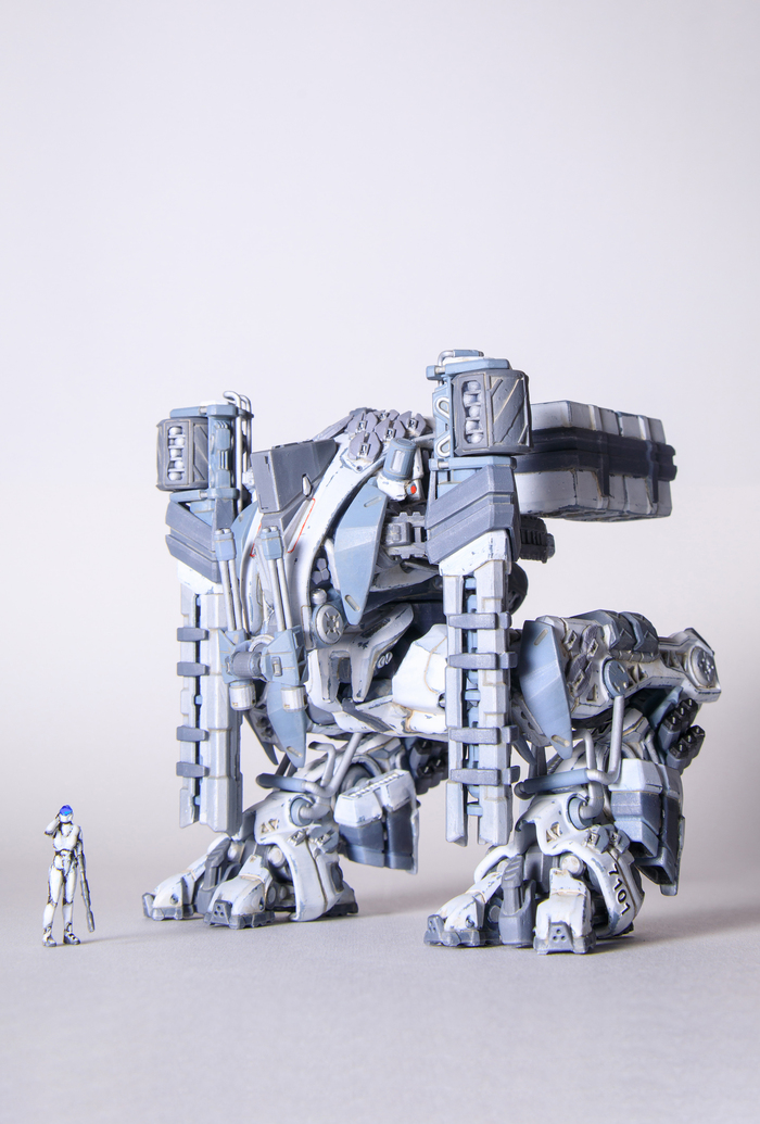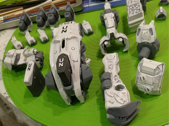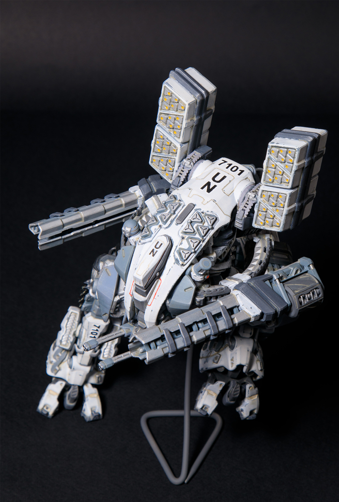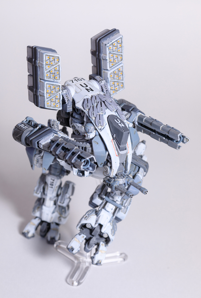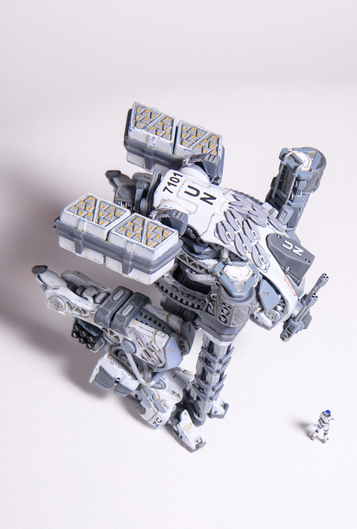 Всегда нравился зимний камуфляж времён второй мировой войны, но воссоздать его правильно на фантастическом роботе я побоялся и тогда пришла мысль сделать “поношенную” окраску миротворческих сил ООН. Такая цветовая схема позволила красиво показать сколы-потёртости и разумно загрязнить в нужных местах.
