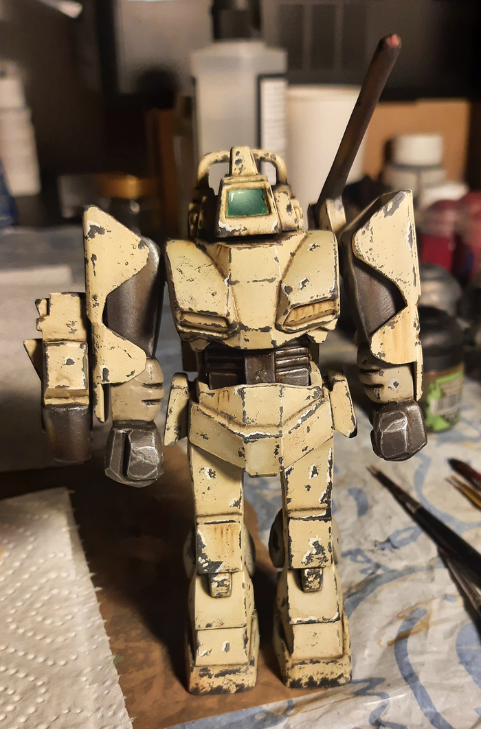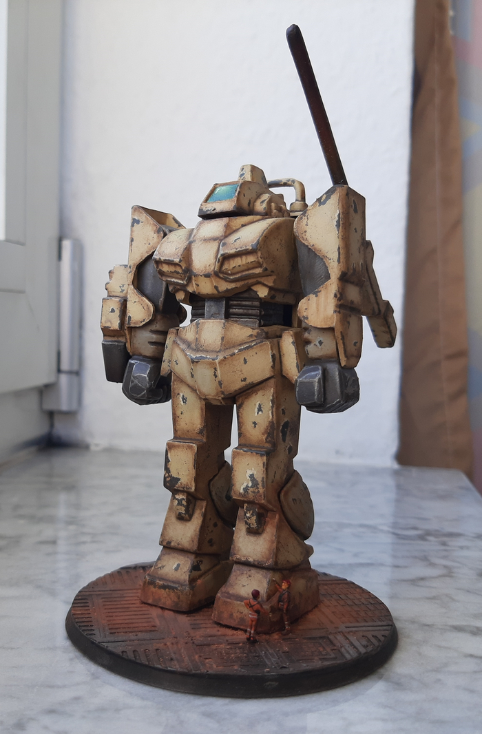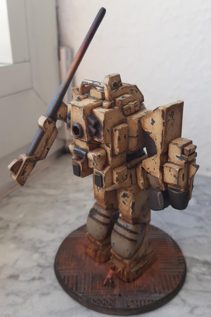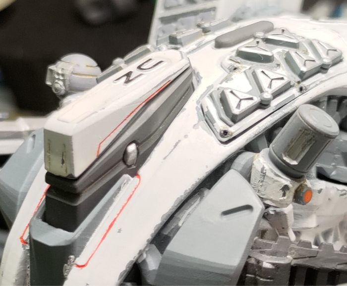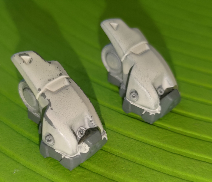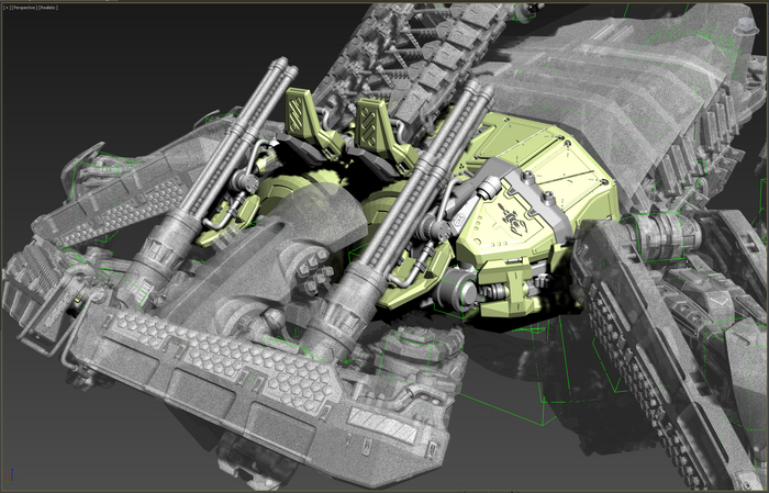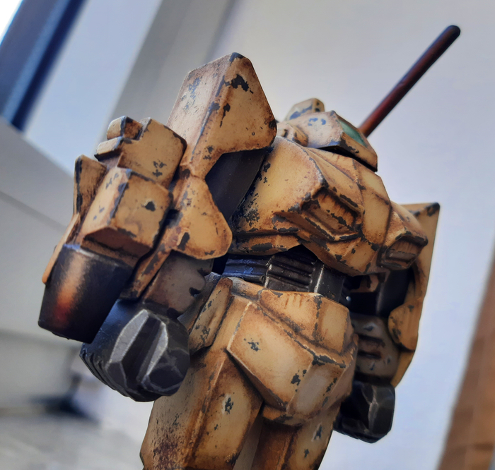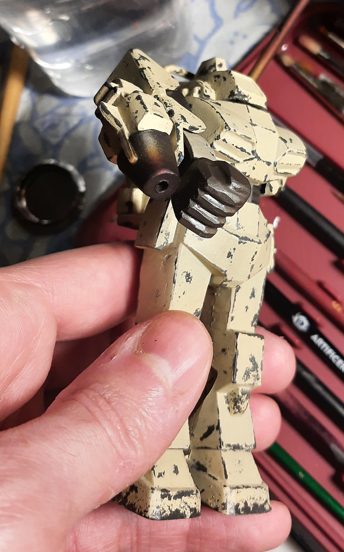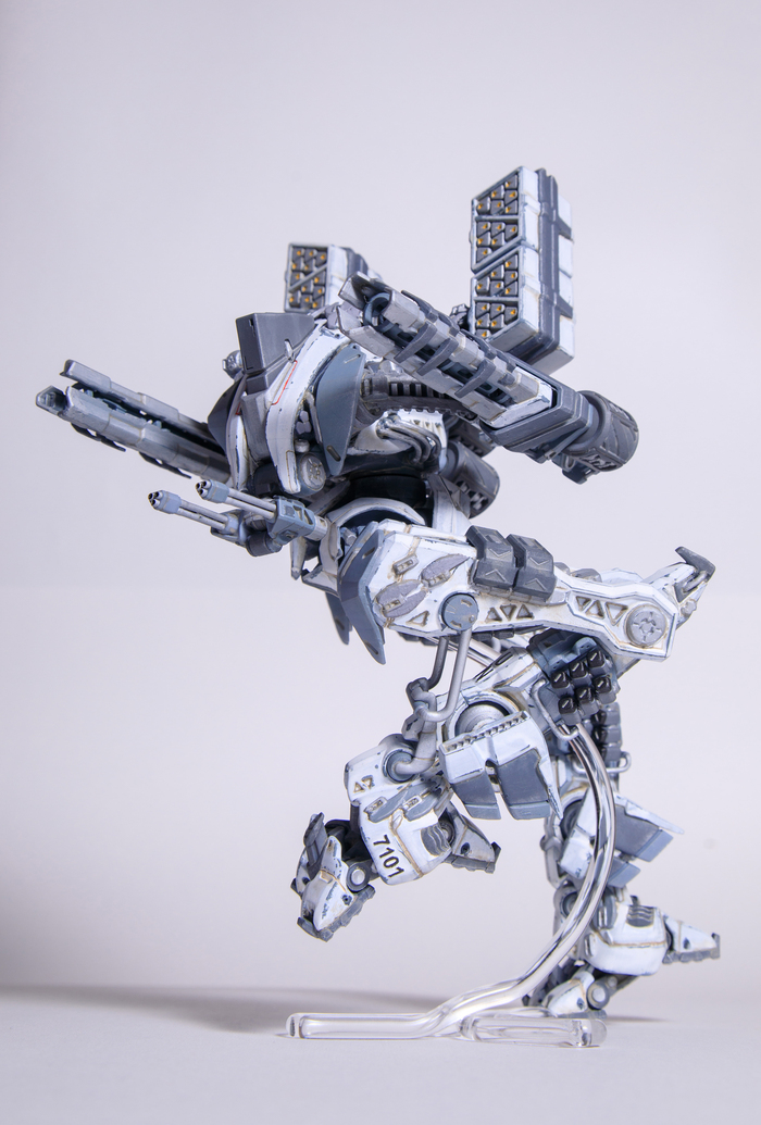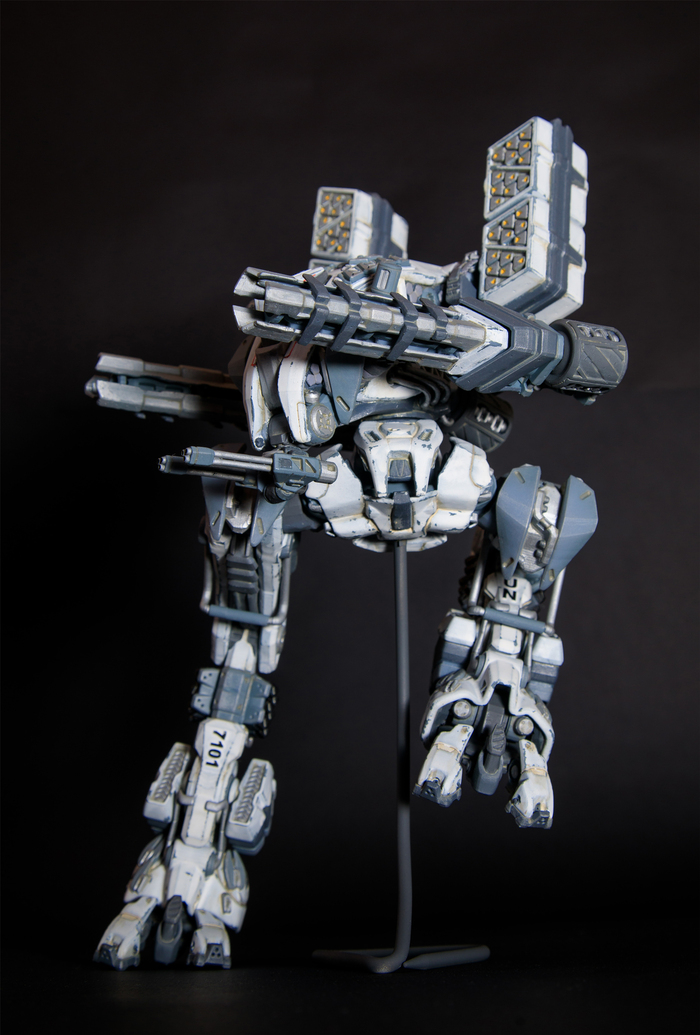 Всегда нравился зимний камуфляж времён второй мировой войны, но воссоздать его правильно на фантастическом роботе я побоялся и тогда пришла мысль сделать “поношенную” окраску миротворческих сил ООН. Такая цветовая схема позволила красиво показать сколы-потёртости и разумно загрязнить в нужных местах.