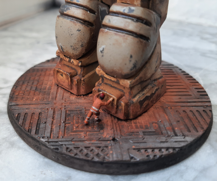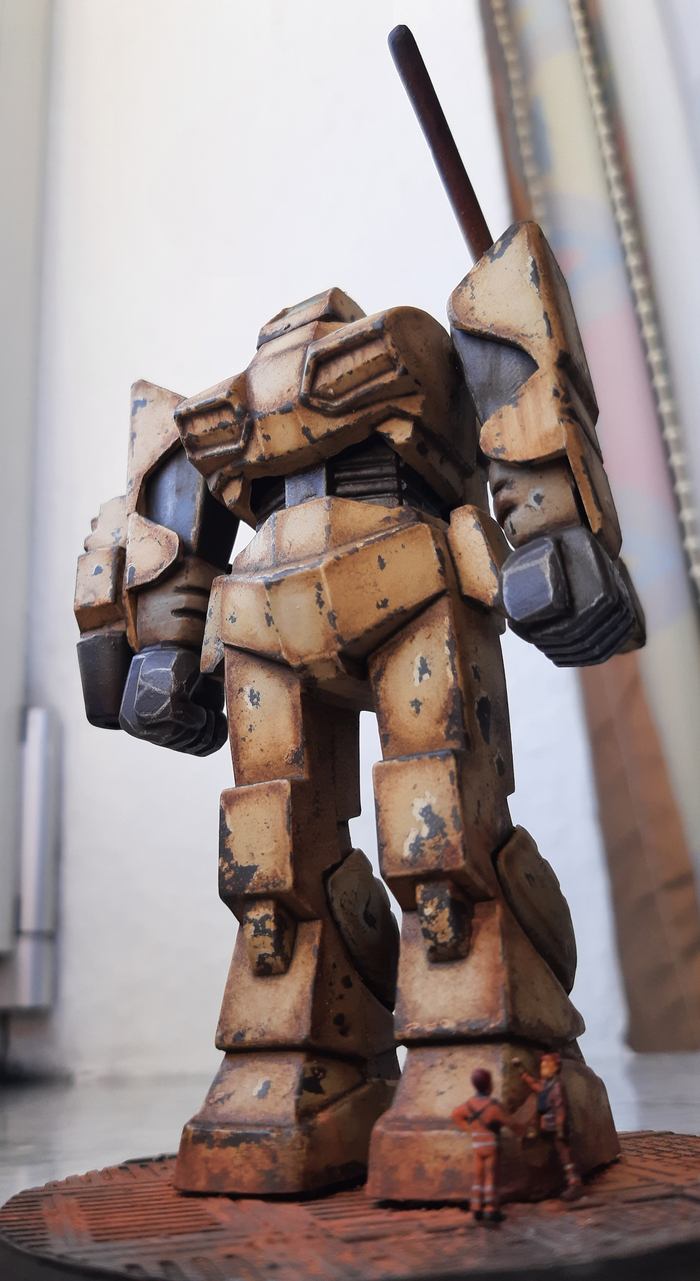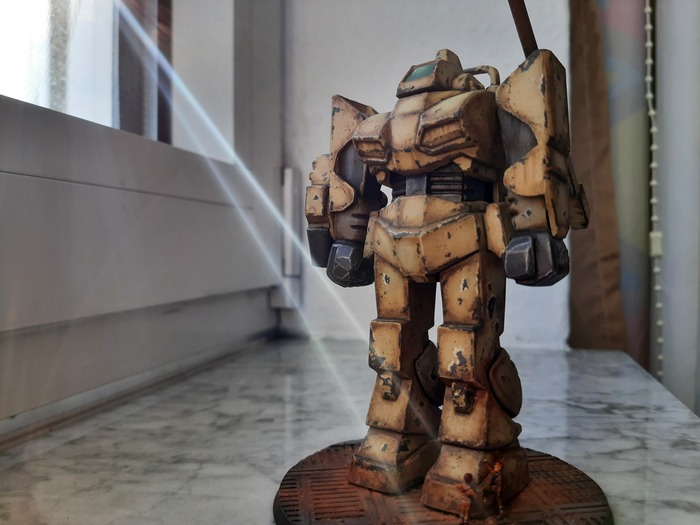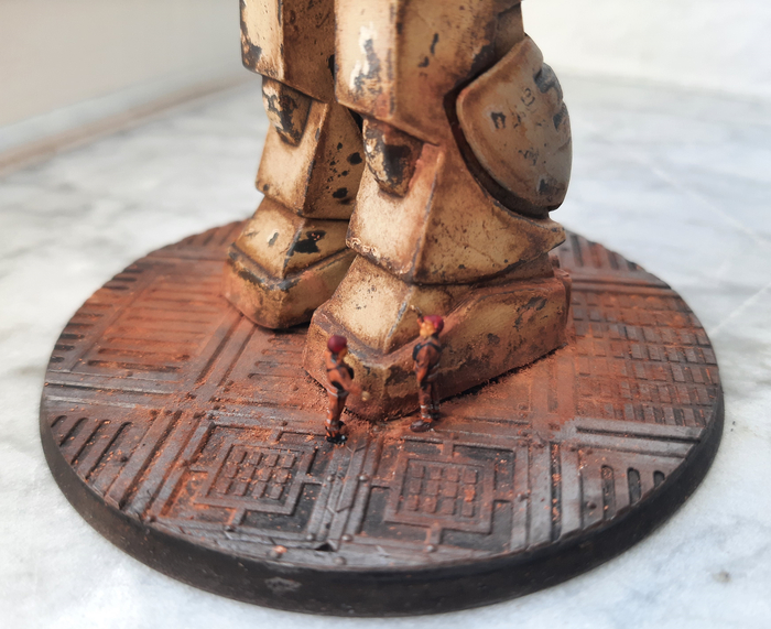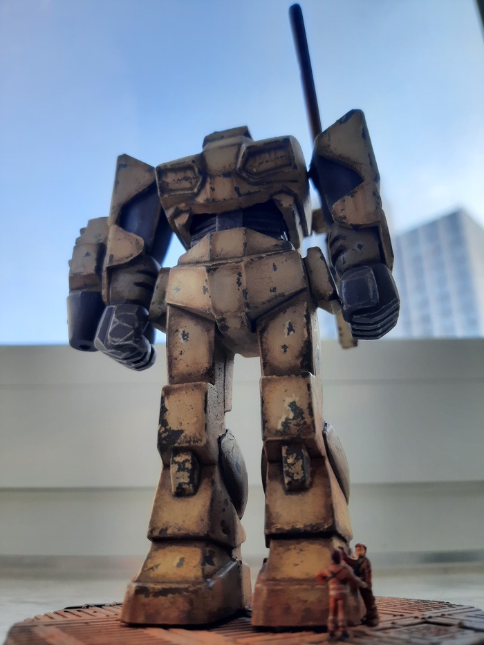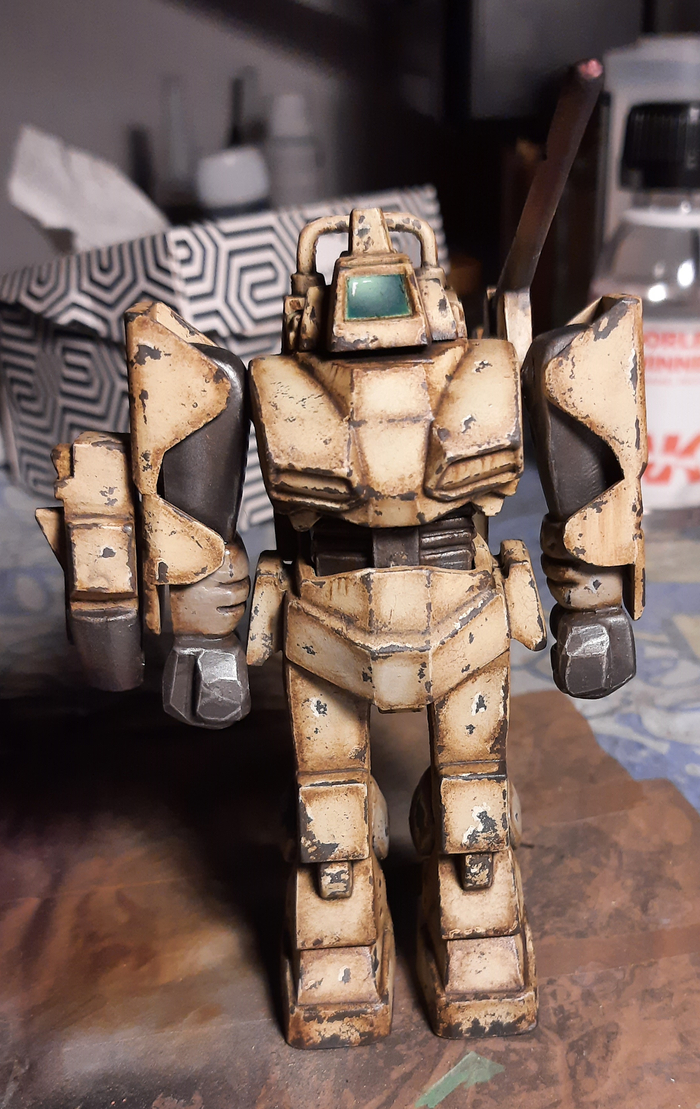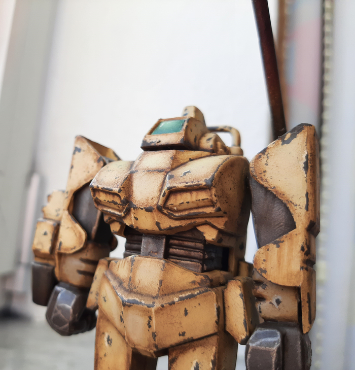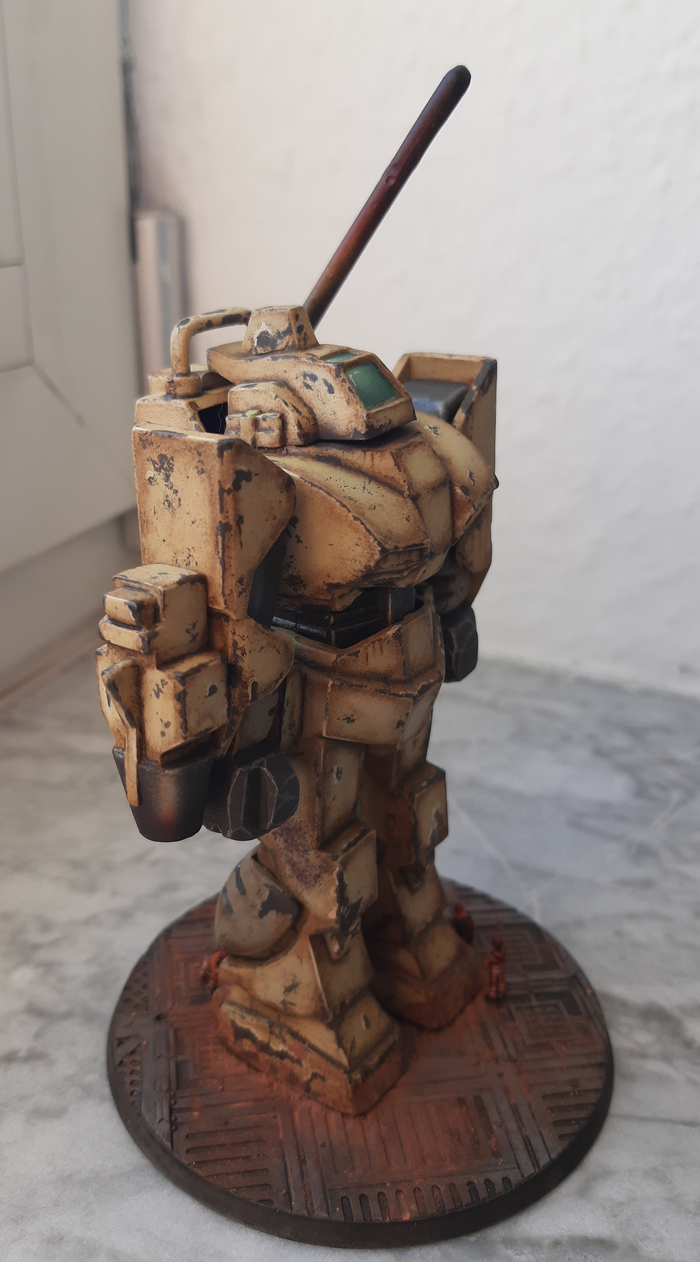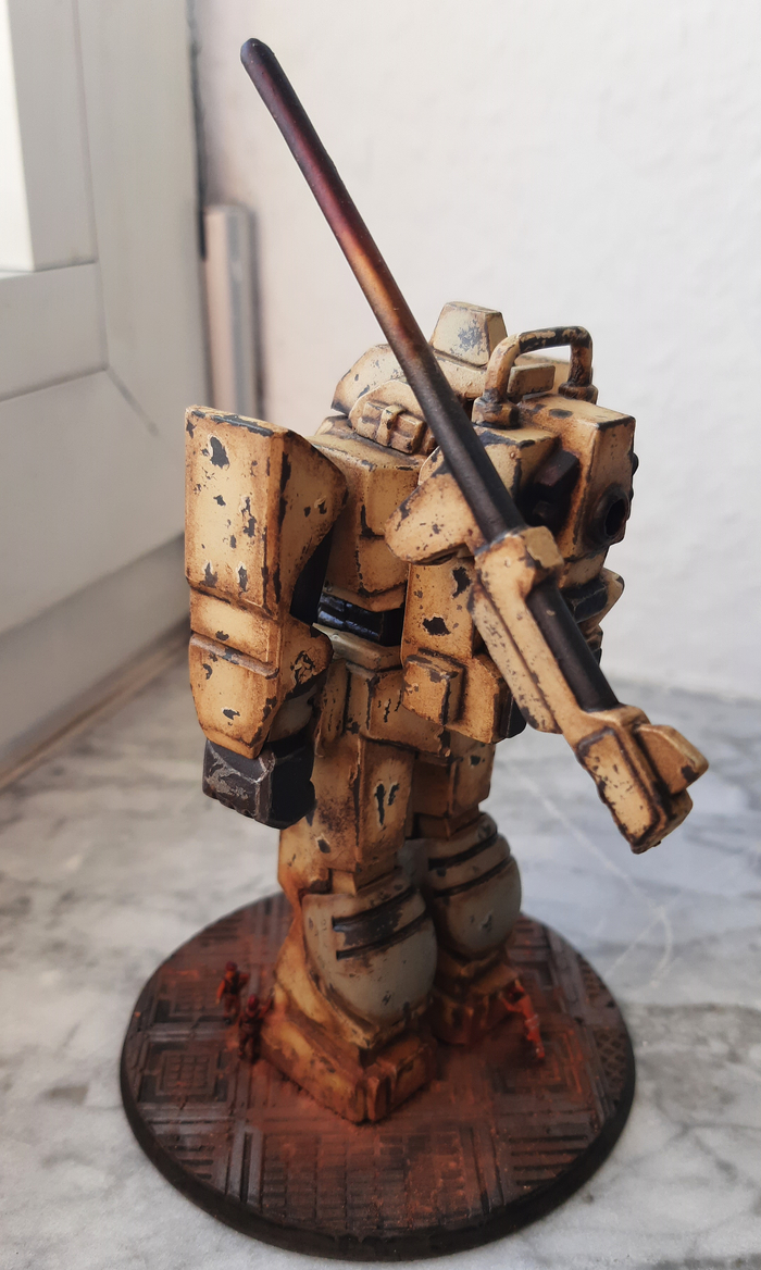 Всегда нравился зимний камуфляж времён второй мировой войны, но воссоздать его правильно на фантастическом роботе я побоялся и тогда пришла мысль сделать “поношенную” окраску миротворческих сил ООН. Такая цветовая схема позволила красиво показать сколы-потёртости и разумно загрязнить в нужных местах.