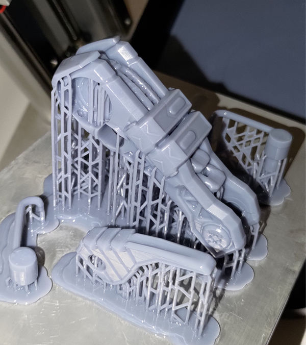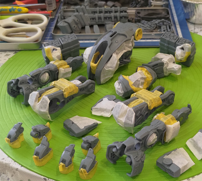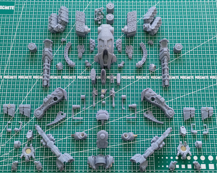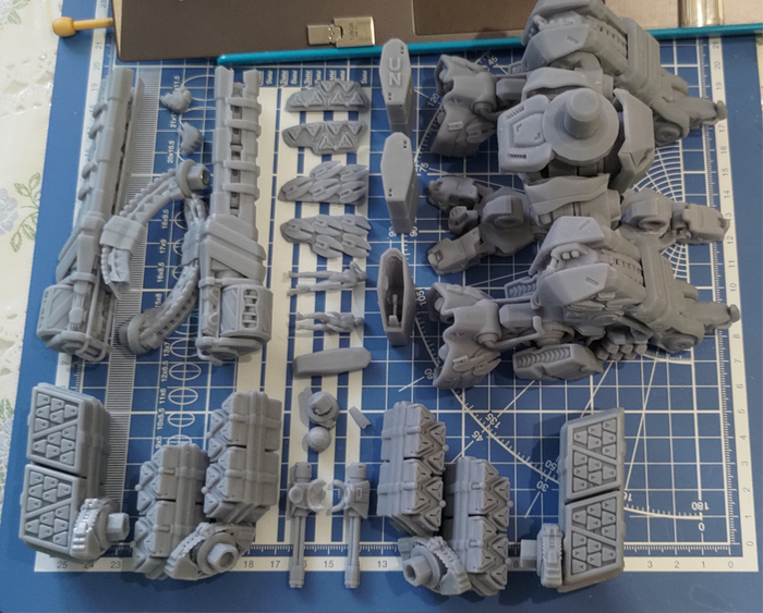 Принтер - Anycubic Photon Mono X. Фотополимер - серая модельная смола от создателей принтера. Печать 3е суток подряд отдельными группами: снимаем готовые детали, принтер не чистим, доливаем фотополимер и запускаем следующую группу. Истратил менее 1 кг смолы (это со всеми поддержками и допечатыванием альтернативных вариантов вооружения).