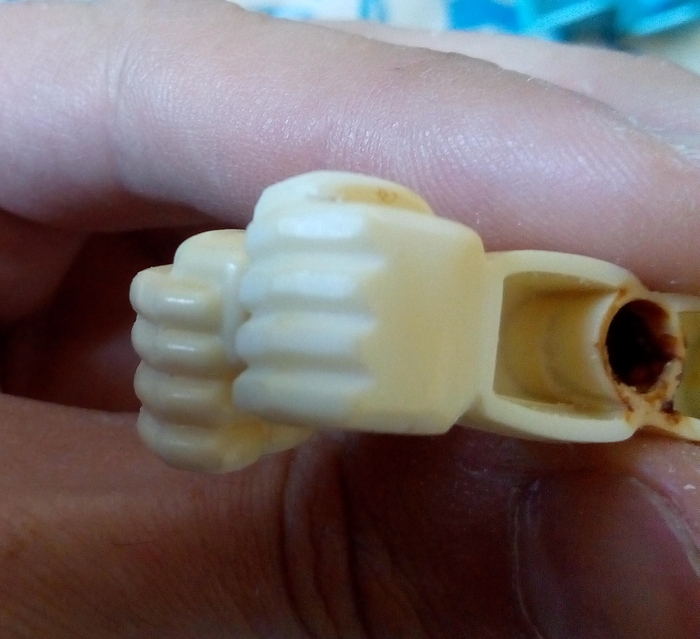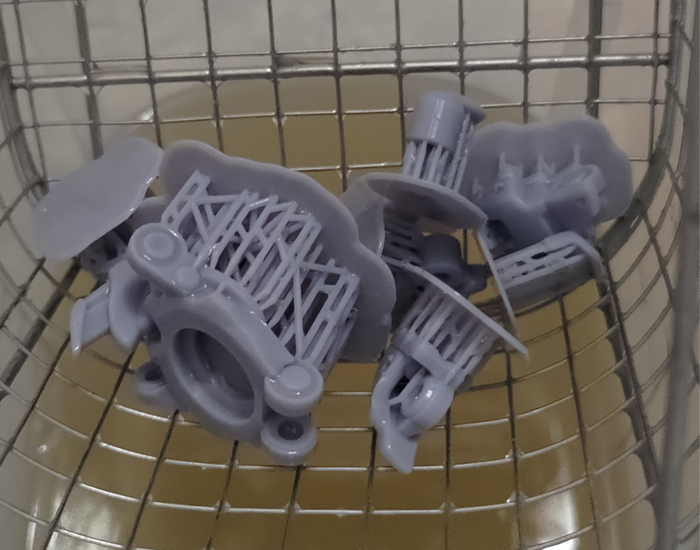 Необходимо аккуратно отделить детали от поддержек. Специфика в том, что если поддержку отломить, то на поверхности детали останется маленькая ямка. Если избежать этого не удалось, то в ямку просто добавляется капелька фотополимера и засвечивается, потом это место обрабатывается.