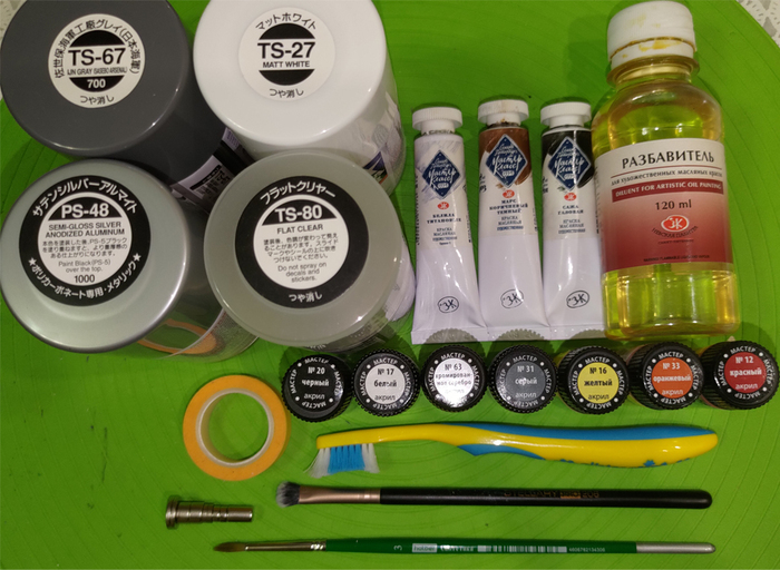 Понадобится не много! Акриловые краски: 4 баллончика Tamiya (тёмно-серый TS-67, белый TS-27, серебряный PS-48 и матовый лак TS-80); 7 цветов Звезда “Мастер акрил” (Чёрный №20, Белый №17, Хромированное серебро №63, Серый №31, Жёлтый №16, Оранжевый №33, Красный №12).