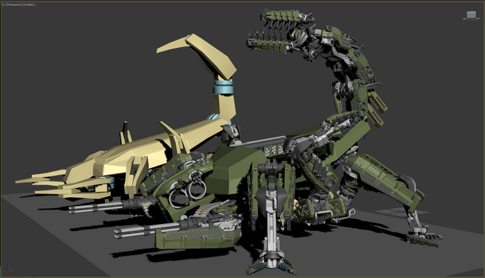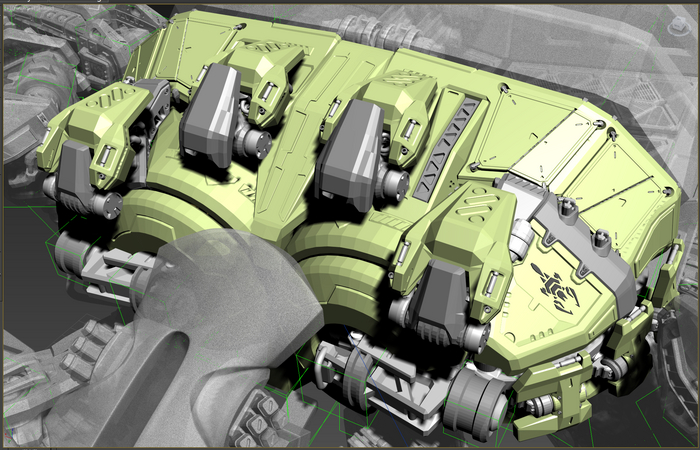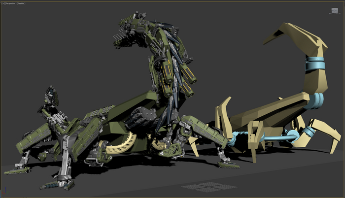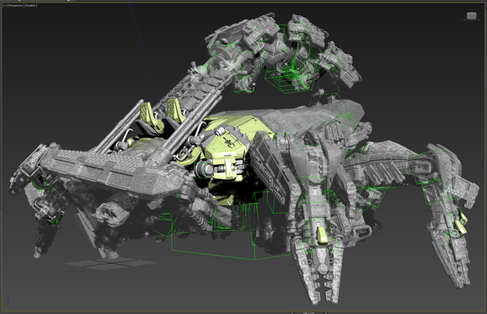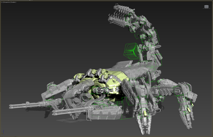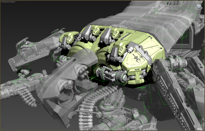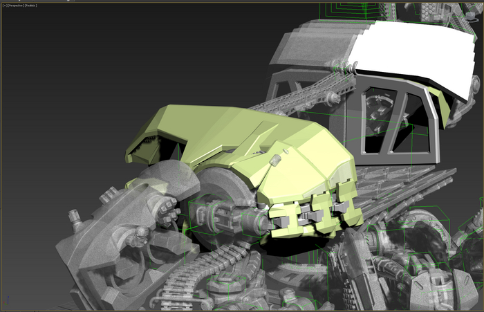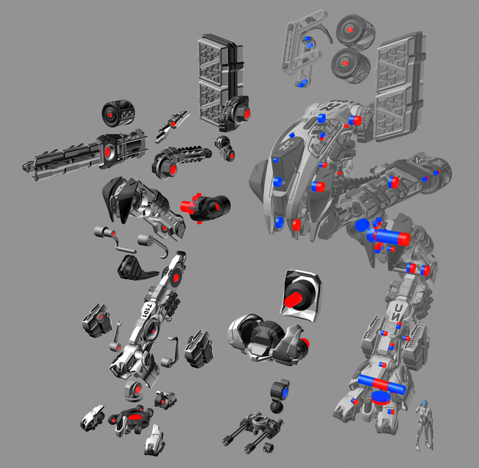 Основные орудия перемещаются по изогнутым рельсам, меняется угол возвышения. Стопы имеют 2 степени свободы. Пальцы можно сжать-разжать. Прыжковые ускорители на лодыжках, каждый крутится вокруг своей оси и вместе на шарообразной основе. Приборы наведения-целеуказания можно поставить в боевое и походное положение.