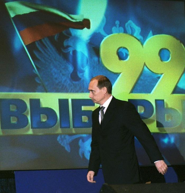 Председатель правительства России Владимир Путин на церемонии открытия информационного центра "Выборы 99" накануне выборов в Государственную думу России. Декабрь 1999 года.