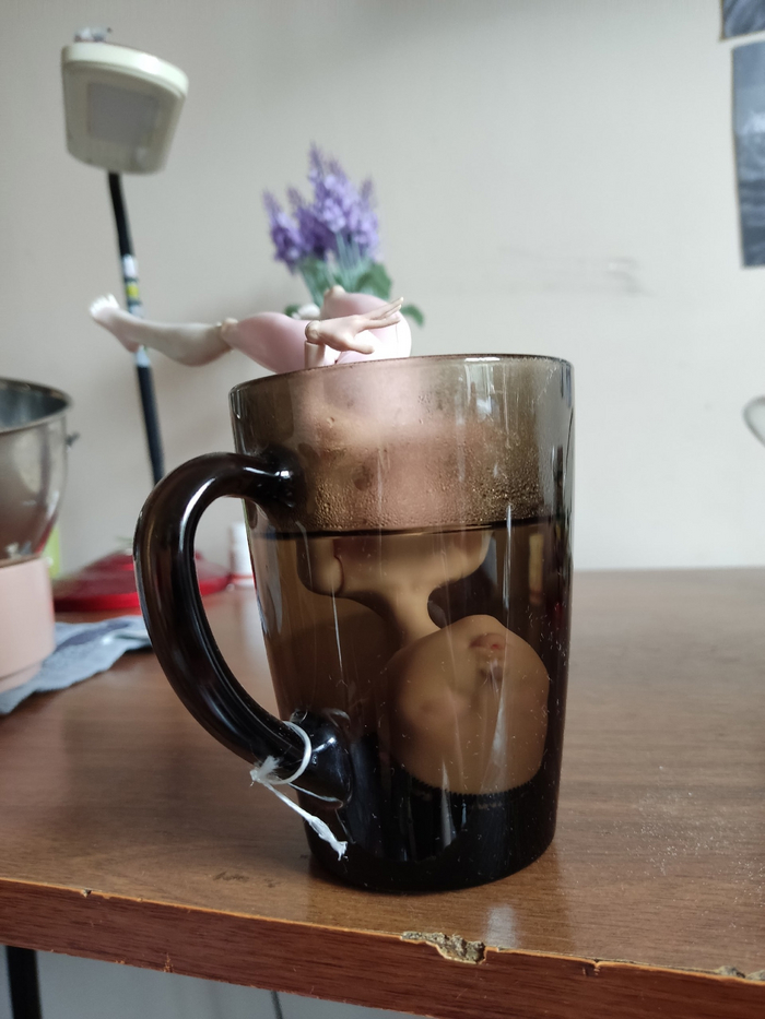 Третий шаг – окончательная эпиляция. В кукольных головах очень много клея, которым фиксируются «корни» их волос, и этот клей вместе с огрызками волос надо вытащить. Для этого необходимо, в первую очередь, снять голову с шеи. Меня эта перспектива немного пугала, потому что кукольные головы держатся на пластиковом «якоре», который в моём понимании легко сломать и невозможно починить. Но пути назад уже не было. Ставим чайник и, когда кипяток перестаёт бурлить, помещаем туда голову.