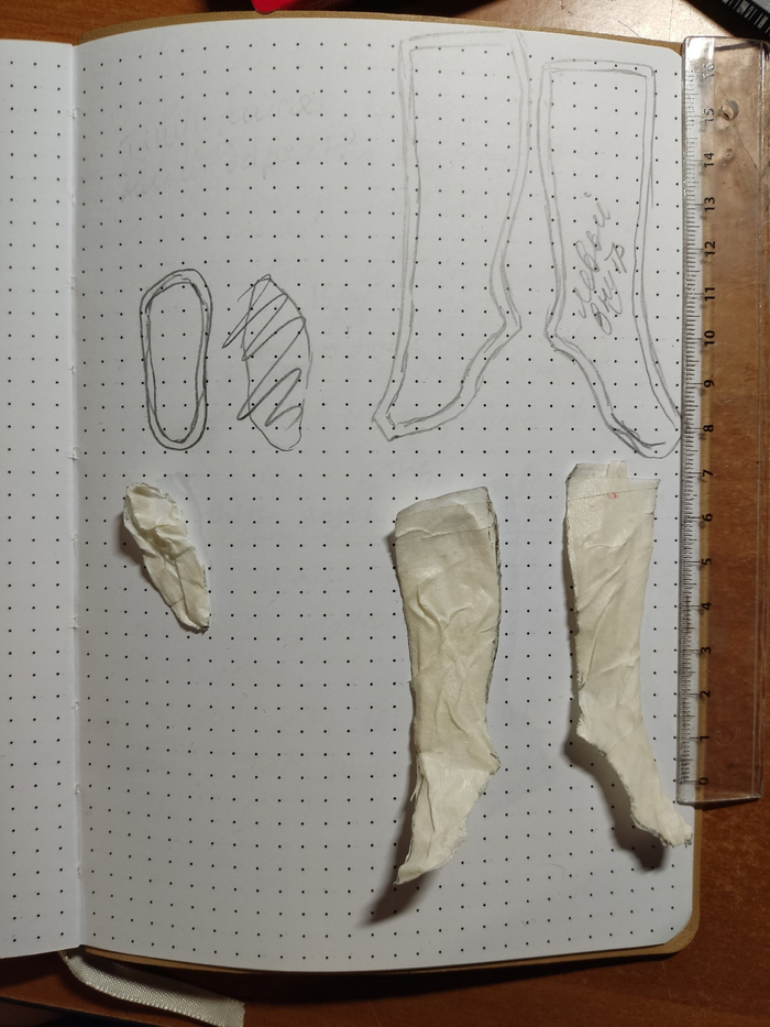 Итак, для получения выкройки сапог я обмотала одну ногу будущей Мокси в несколько слоёв малярным скотчем (выглядело похоже на гипс), придавила, чтобы он облип ногу по форме, затем разметила детали выкройки и прямо на кукле разрезала по разметке (выглядело похоже на снятие гипса). Фото в процессе я сделать забыла, зато есть фото деталей, перенесённых на бумагу.