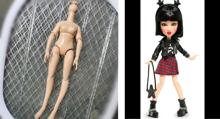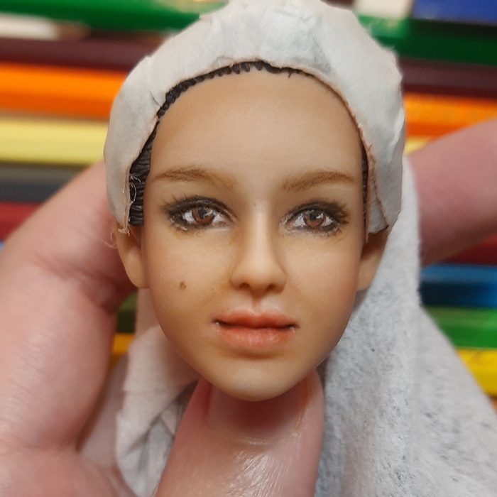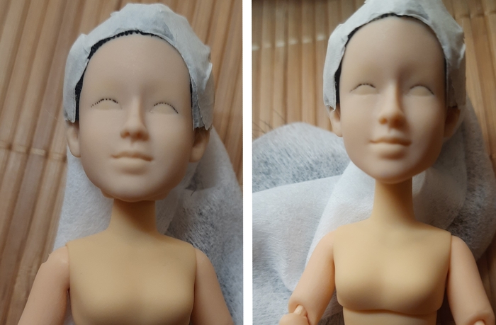 Для начала нужно было убрать блеск с тела путем ошкуривания его мелкой наждачкой (или бафом для ногтей), затем обезжирить, залить клиром и просушить (Лак-спрей Mr. Hobby Super Clear UV Cut Flat - что-то вроде грунта и закрепителя для макияжа кукол, придает бархатную текстуру пластику/винилу/резине, по нему можно рисовать карандашами (акварельными), как по бумаге, при этом пигмент не будет въедаться в сам материал куклы, а так же закрепляет все нарисованное финишным покрытием и защищает от внешнего воздействия (солнца, например)). ВАЖНО - при работе с клиром обязательно выходить на балкон, улицу, хорошо проветриваемое помещение, надевать респиратор и перчатки, желательно еще защиту для глаз. За разбрызгивание его в подъезде соседи "спасибо" не скажут, т.к. он жутко вонючий.