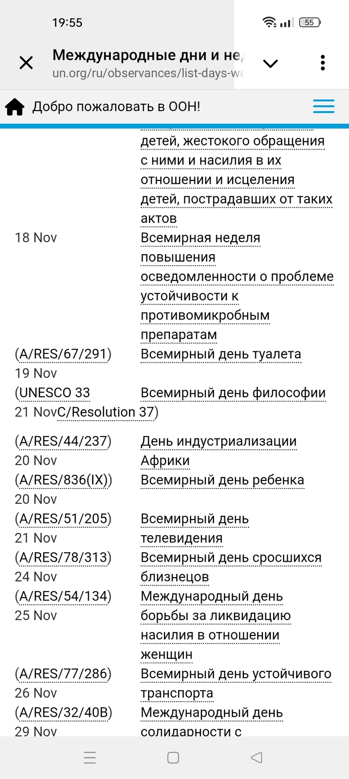 В международном календаре ООН есть 11 дат, посвященных девочкам и женщинам. До недавнего времени была одна дата в честь международного мужского дня 19 ноября. Но ее убрали, и теперь там значится "День туалета".