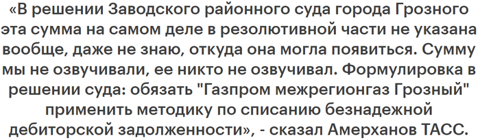 Заместитель генерального директора по реализации газа «Газпрома» Рустам Амерханов назвал «информационным вбросом» сообщения о том, что суд в Грозном обязал компанию признать безнадежными к взысканию накопленный жителями Грозного долг в 9 миллиардов рублей. Амерханов указал, что в решении суда этой суммы вообще нет, сообщает ТАСС.