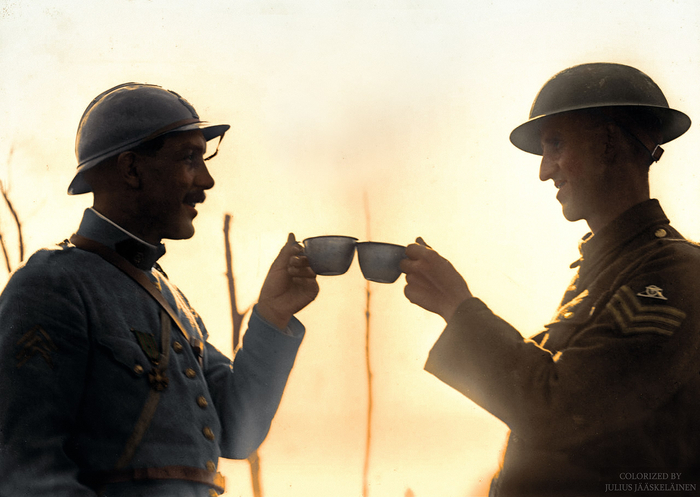 Нельзя сказать, чтобы тыловые службы вооруженных сил Франции игнорировали эту проблему. Несмотря на то, что их первой заботой всегда было «накормить» фронт боеприпасами, оружием и прочими боевыми материалами, в 1914-15 гг. интенданты по мере сил и фантазии пытались насыщать солдатское меню продуктами, сразу готовыми к потреблению и предоставляющими необходимый запас питательных веществ и витаминов. Во французских окопах в этот период не были редкостью колбасы и прочие мясные деликатесы, сыры, свежие фрукты. С сентября 1914 г. началась выдача алкогольных напитков, причем не только в частях действующей армии, а вообще – всем военнослужащим. Первоначально винная порция во Французской армии составляла четверть литра «в винном эквиваленте» ежедневно. Как правило, это было дешевое красное столовое вино, изготовляемое виноделами из остаточного винного материала разных сортов, именовавшееся в обиходе pinard. По мере того, как командование осознавало степень чудовищного физического и морального напряжения, которой подвергались бойцы на линии огня, вино с его несомненными тонизирующими и целебными свойствами приобретало все большую роль в поддержании «духа войска». В 1915 г. порция была увеличена до полулитра, а в 1916 – до 750 граммов.
