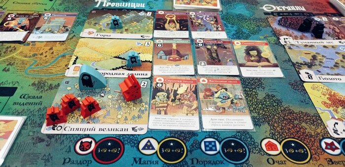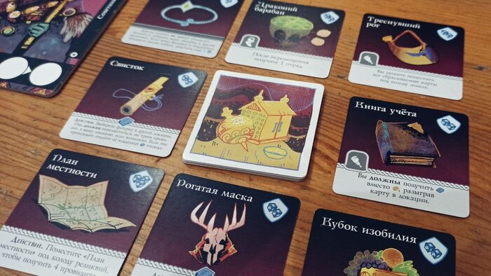 Ещё в игре много карт. Их можно разыгрывать в локацию или на свой планшет. С этими картами можно торговать, нанимать войска, получать секретики или жетоны поддержки. Некоторые карты помогут вам сделать очень много гадостей, например "Древний договор". Он заставляет всех игроков сжечь свои секреты. Какие-то карты помогут вам в нападении или обороне.