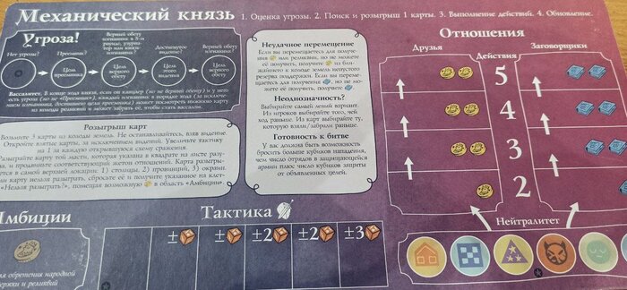 Вариаций, что можно сделать в свой ход много. Сначала путаешься, но очень быстро понимаешь, что к чему. В основном, если игра идёт через захват территорий, то тебе нужно нанимать войска, совершать набеги на локации. Если игра идёт не через захват территорий, войска всё равно нужно нанимать, чтобы твои реликвии и знамёна не отобрали. Мирной победы тут не будет.
