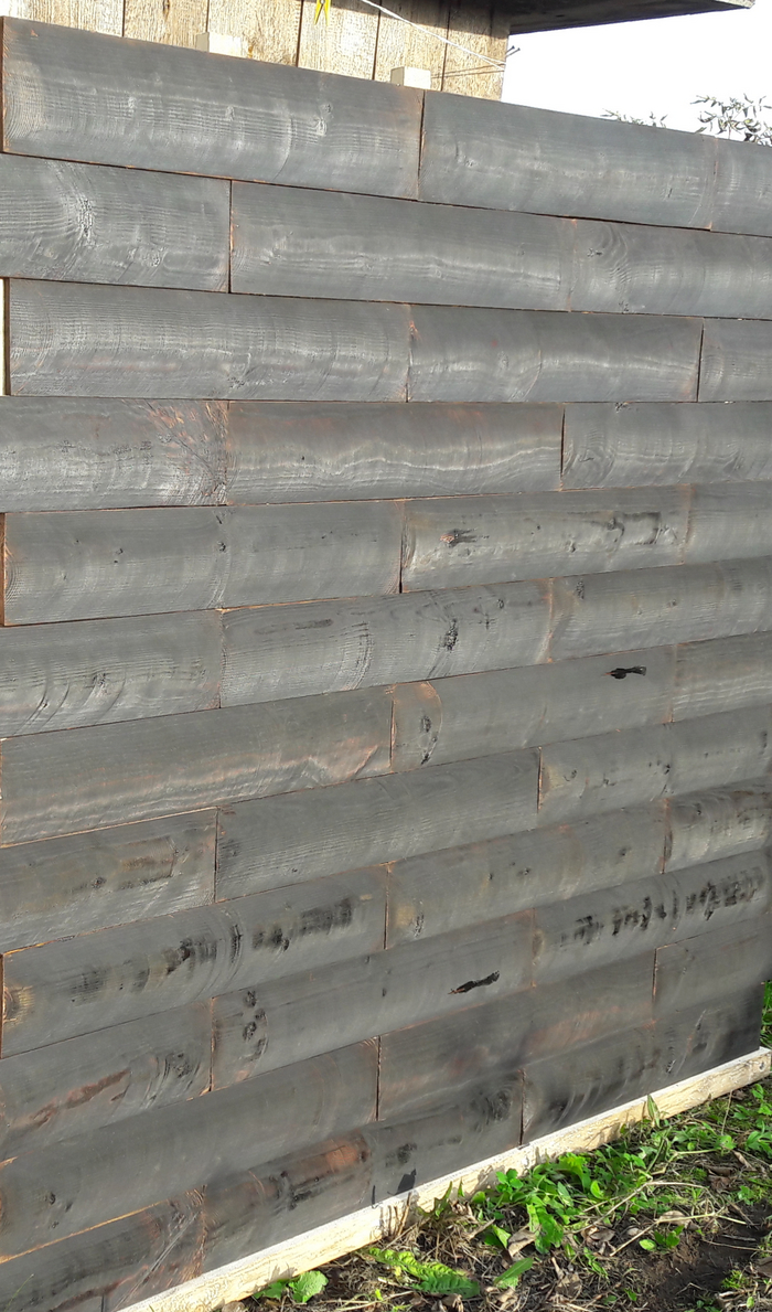 В классическом варианте деревянные панели обжигают только с одной стороны. Стандартная толщина доски — 10-15 мм. Для достижения нужного эффекта три доски продольно связывают вместе, образуя треугольный туннель. В один из концов засовывают охапку соломы и поджигают, переворачивая конструкцию в вертикальное положение. При работе с длинными досками треугольную связку поднимают при помощи веревок, переброшенных через перекладину.