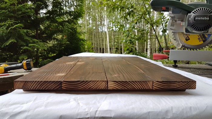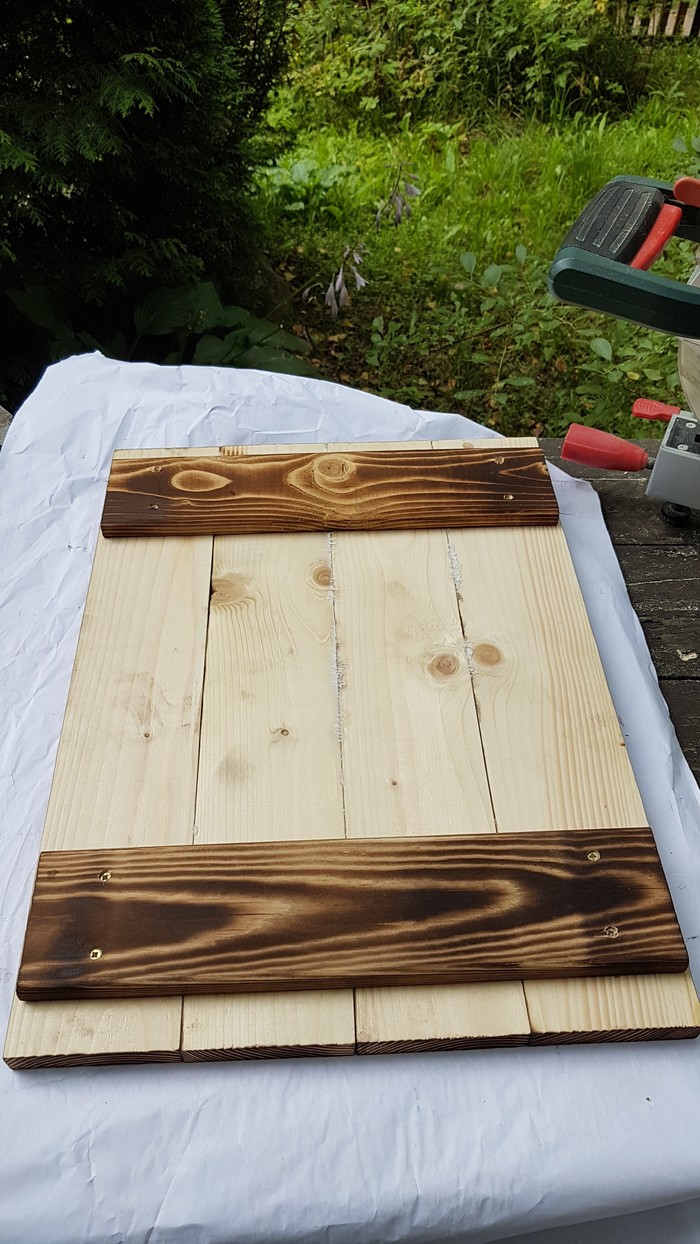 Такая процедура должна помочь щиту сохранить форму и не разъехаться доскам в стороны. Для надёжности, я ещё и сзади скрепил щит двумя досками: