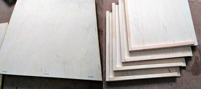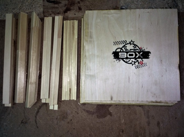 Фанера ( 260Х260мм-4шт боковины, 257х257 дно, 262х262 крышка), а также другие деревянные детали после распиливания: