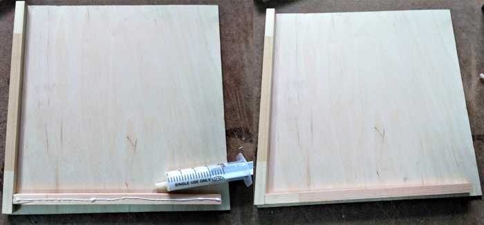 Оставшийся брус (11х11мм) нарезаем на 4 отрезка по 230мм., наносим ПВА и после приклеивания впритык к первому брусу (с нижней стороны так, чтобы под ней до края фанеры оставалось 3 мм помним, что первый брус 257мм), пробиваем с внешней стороны скобой (в шприце ПВА, рекомендация коллеги,  Артём, если читаешь, привет!)