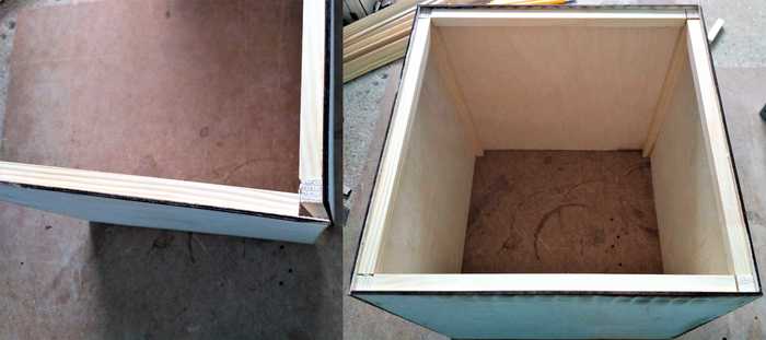 Уголок (20х20х2200мм), пилим четыре штуки по 260мм, наносим клей и прижимаем к вертикальным углам ящика (прижал тем, что было),  теперь декоративная отделка, значит никаких скоб, только ПВА.