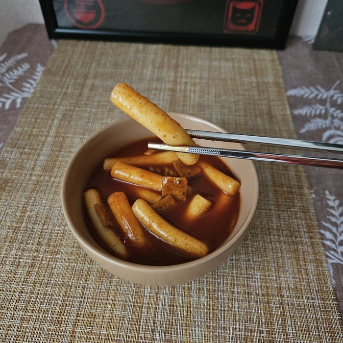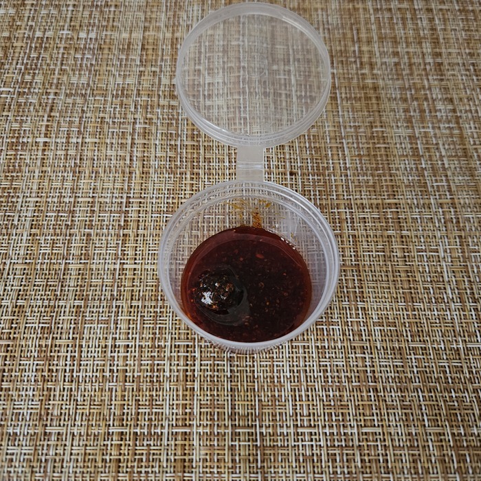 Далее приличная порция коричневого пряного соуса. Запах и вкус как у соевых снеков Латяо один в один. Острота незначительная, но есть.