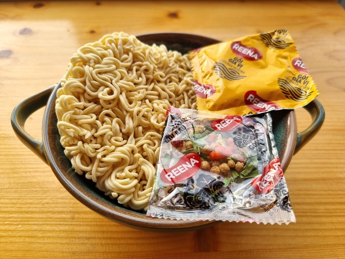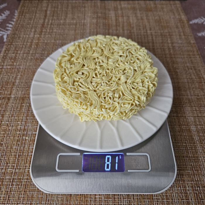 Вполне себе богато, за эту цену. Поэтому давайте рассмотрим всё поподробнее. Традиционно начинаем с лапши. Она пшеничная, ярко-жёлтая в круглом брикете. При этом интересной формы (плоская) и пахнет как кукурузные палочки Джокер (кто помнит) со вкусом пиццы. Масса, как и обещано, около 80 граммов.