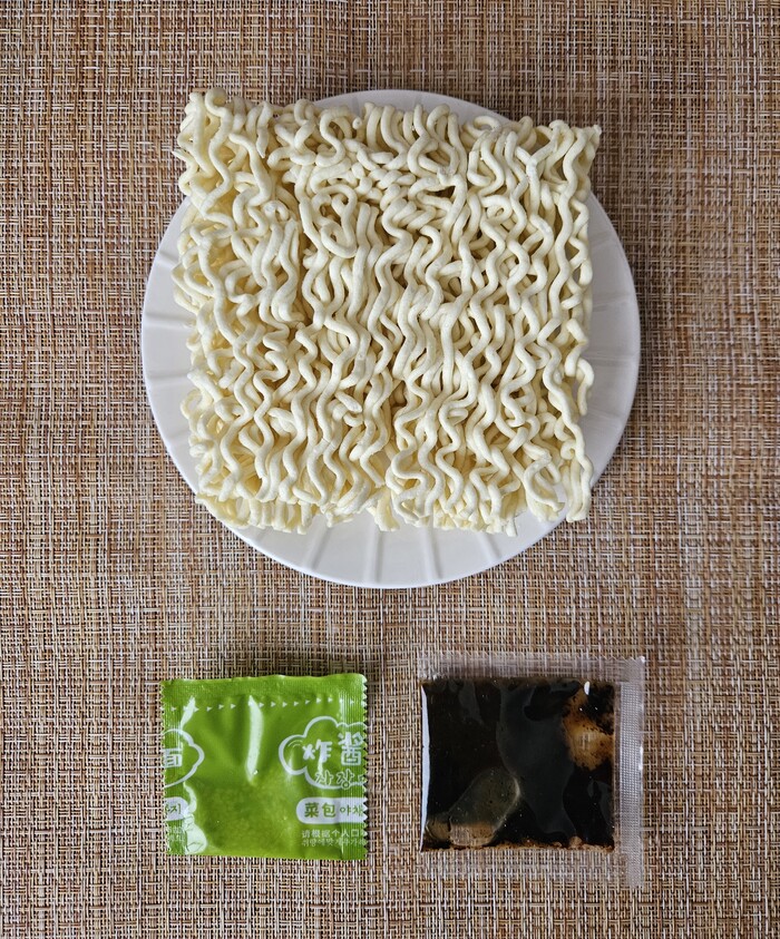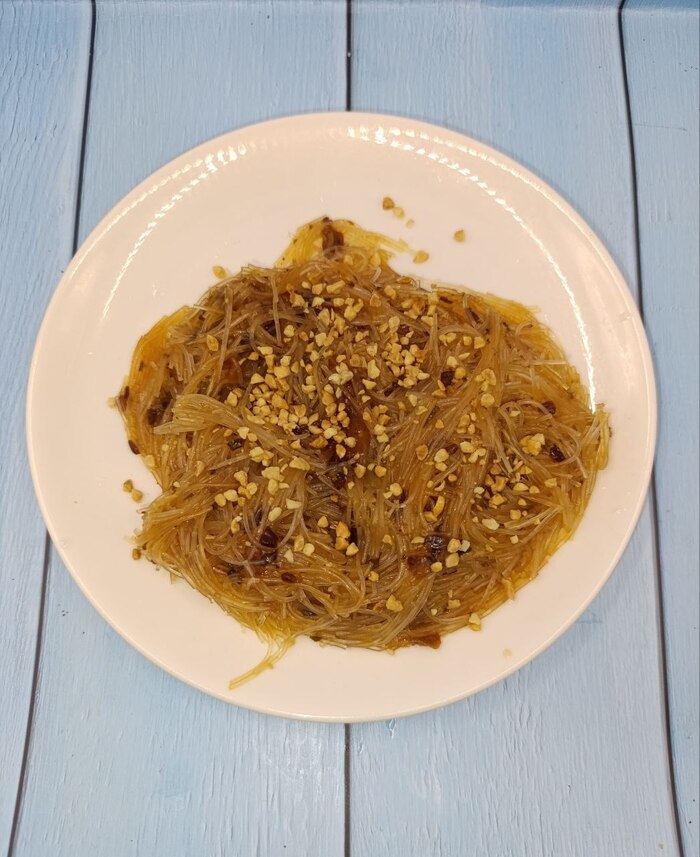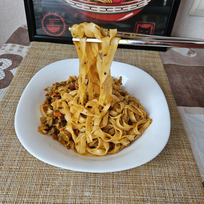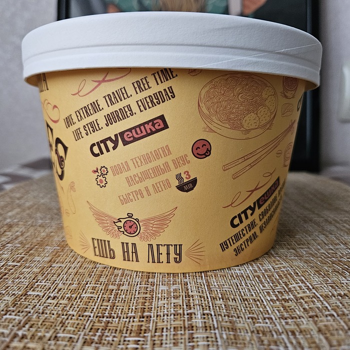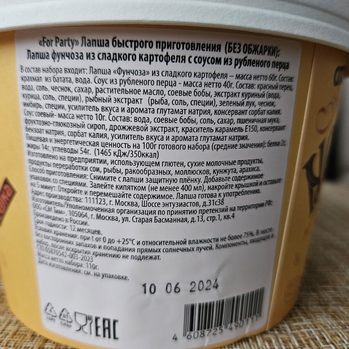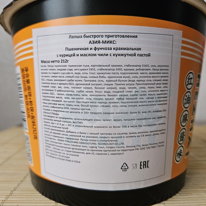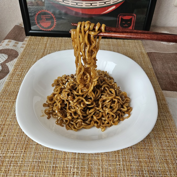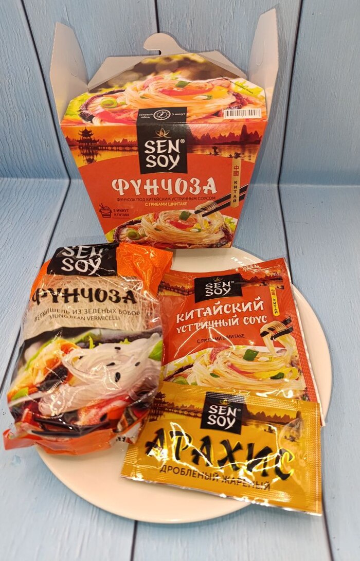 Я впервые вижу не длинную фунчозу, а порезанную чуть ли на вермишель. Соус обычный, сверху арахис, всё таки длинная лапша вкуснее, может по-другому соус в нее впитывается, не знаю. Но неплохо, всё по классике.