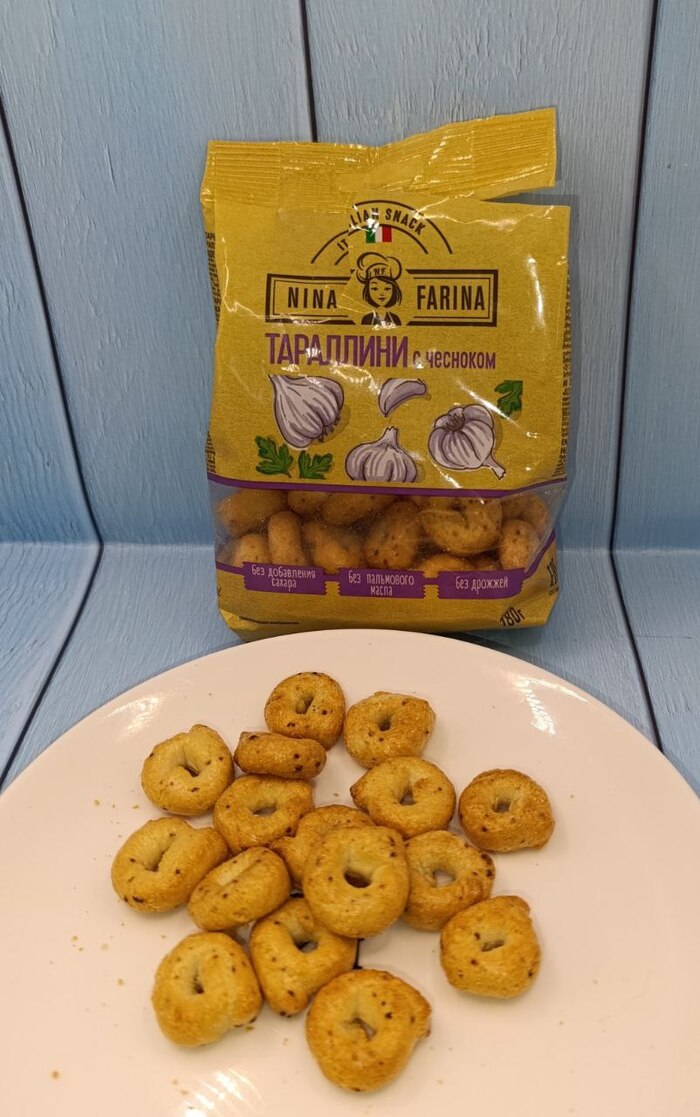 Тараллини — это итальянские сушки, которые сначала отваривают, высушивают, а потом запекают в духовке. Ну значит флаг Италии на упаковке хоть как-то оправдан, потому что сделан продукт в Воронеже. Это лёгкие (на первый взгляд) хрустящие сушки с чесноком и травами, ароматно и вкусно, но количество калорий и углеводов буквально заставляет вытащить руку из пачки. Рекомендую как перекус, но не увлекайтесь)