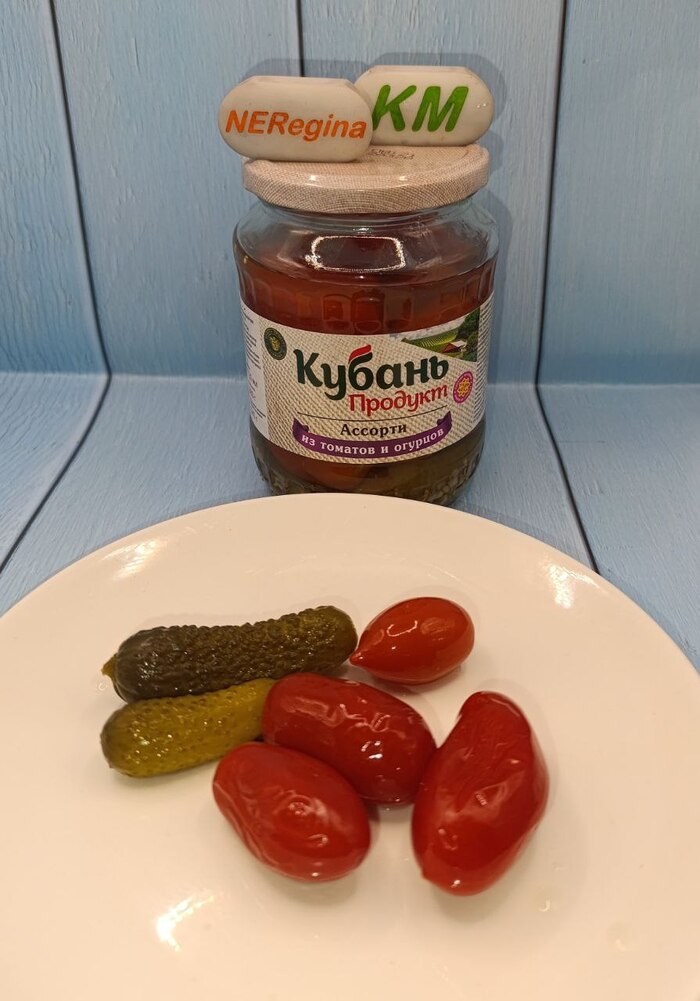 Ассорти из помидоров и огурцов 680 грамм за 125 рублей.