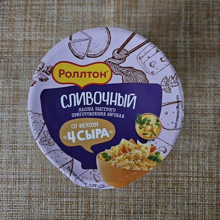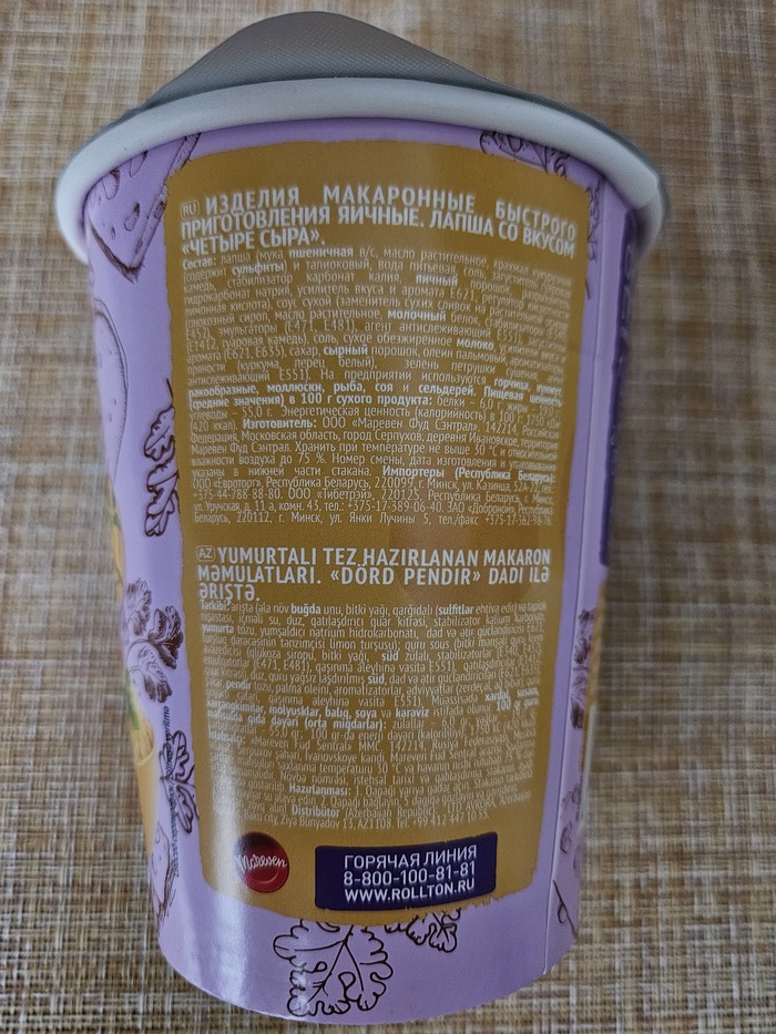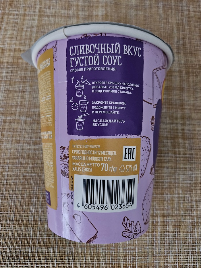Сверху на стакане крышка из фольги с инструкцией по приготовлению и надписью, обещающей нам пылающее сырное безумие.