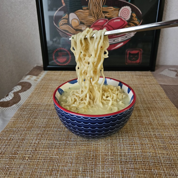 Инструкция предлагает нам два варианта приготовления: в микроволновке и путём заваривания. Я решил готовить завариванием. Поэтому лапшу выкладываем в стакан, заливаем кипятком до линии и на 4 минуты закрываем крышкой. Затем сливаем воду, добавляем содержимое всех пакетов и тщательно перемешиваем. Сырный порошок категорически отказывался растворяться и сбивался комками, поэтому пришлось добавить буквально пару капель воды, чтобы он лучше разошёлся. Острый соус я добавил весь, т.к. хочется ощутить весь вкус блюда.