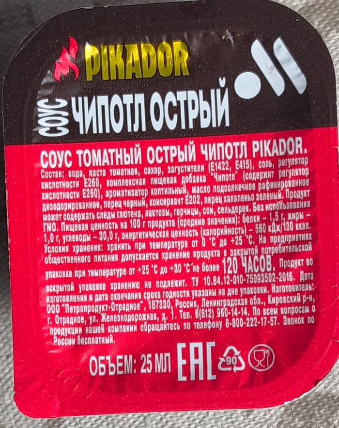 Томатный соус чипотл. Слово "острый" в его контексте явно лестное преувеличение, потому что даже для меня это кисловатое гастрономическое изделие едва обдало сосочки языка теплом. Пикантный кисловатый соус.