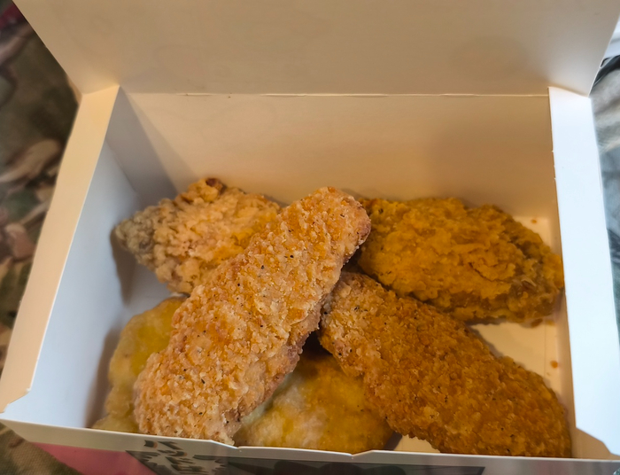 Выглядит хорошо. За двадцать минут езды плюс время на подготовку к обжорству: панировка у наших убиенных курвочек не отсырела. Хрустит. Мясо и правда достаточно нежное, но всё-таки суховато по мне. Без соуса есть совершенно не в кайф. Правда нам же для этого дают соут. Чего я опять выкобениваюсь.
