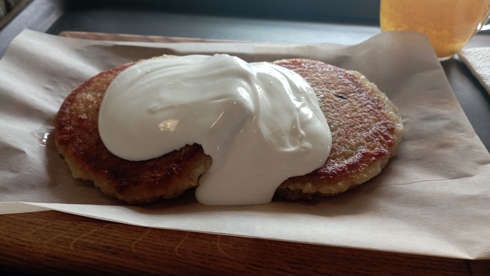 Два увесистых толстых драника залитых сметаной. Вкус добротный, форму держат и не разваливаются при попытке отрезать кусочек. 8/10