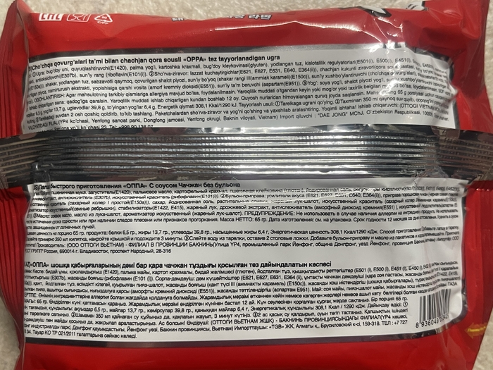 Фото вышло максимально неэстетичным , извините. Порция получилась маленькая, за 79 рублей могли бы и сделать что-то побольше! По запаху. Пахнет как чачжан мён от доширака, но на минималках. Лапша осталась упругой и не разварилась. Что-то среднее между дешевым роллтоном и лапшой фирмы Мама. По вкусу это как тот же чачжан мён от доширака, но очень на минималках. Собственно, ожиданий фееричного вкуса изначально не было, ведь в пакетике была сухая смесь, а не жидкий соус. Остроты нет совсем. Возьму ли я еще раз такую лапшу? Только если по акции, на «черный день» в качестве гарнира самое то. P.s: лапша Oppa Том Ям рекомендуется к покупке любителям острого и плотного бульона.
