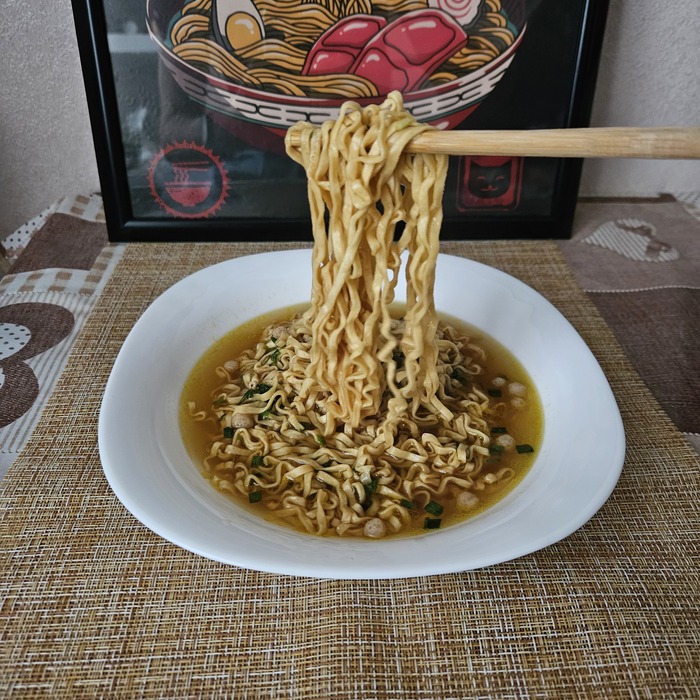 Лапша, как ожидалось, плотная, приятная. Но разница в ширине удивляет - то очень тонкая, то сразу в половину вилки. Но мозг не обманешь - наличие только лапши и бульона не делает его тем самым Том Ямом: все равно машинально ожидаешь выловить грибочек или креветку.