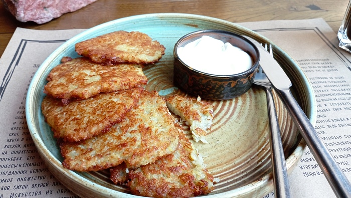 Кушанье подали с гороховыми ростками. Вкус у драников невероятный, мощный. Режутся ровно и чётко. Я бы сказал что это эталон всех драников. Слегка хрустящая корочка и до невозможного густая сметана. 10/10